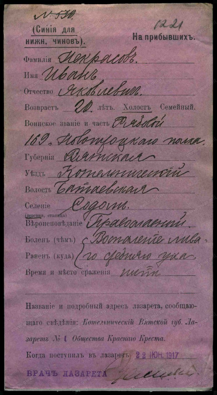| участие в Первой Мировой войне | 1914 - 1918 | Должность/Звание рядовой Воинская часть 169-й пехотный Ново-Трокский полк Место рождения Вятская губ., Котельничский уезд, Батаевская вол., д. Содом Причина выбытия болен Дата события 22.06.1917 Тип документа Карточка на прибывших (нижние чины) Архив Российский Государственный Военно-исторический архив Фонд Картотека бюро учета потерь в Первой мировой войне (офицеров и солдат) Шкаф без номера Ящик 4622-Н Должность/Звание рядовой Воинская часть 169-й пехотный Ново-Трокский полк Причина выбытия болен Дата события 24.04.1917 Тип документа Отчетно-осведомительные карточки Архив Российский Государственный Военно-исторический архив Фонд Картотека бюро учета потерь в Первой мировой войне (офицеров и солдат) Шкаф без номера Ящик 2484-Н | |