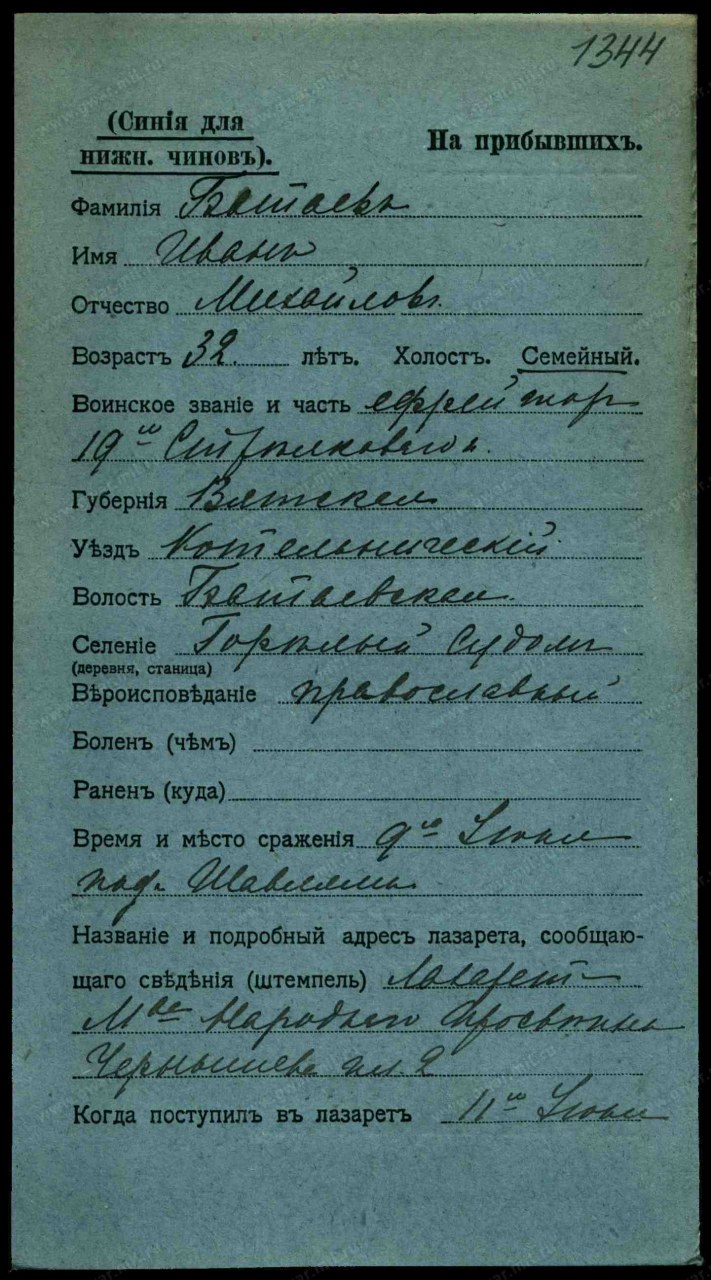 | участие в Первой Мировой войне | 1914 - 1918 | Должность/Звание ефрейтор Воинская часть 19-й стрелковый полк Место рождения Вятская губ., Котельничский уезд, Батаевская вол., д. Содом Причина выбытия ранен/контужен Место выбытия бригадный лазарет 5 стрелковой бригады Дата события 09.06.1915 Место события г.дв. Порингово Тип документа Именные списки потерь Архив Российский Государственный Военно-исторический архив Фонд №16196, Особое делопроизводство по сбору и регистрации сведений о выбывших за смертью или за ранами, а также пропавших без вести воинских чинах, действующих против неприятельских армий (1914 - 1918) Опись №1, Именные списки потерь солдат и офицеров 1 мировой войны 1914-1918 гг. (по полкам и бригадам) Дело №740, Списки потерь солдат 19 стрелкового полка Документ №169441, Именной список потерь нижних чинов 19 стрелкового полка в боях у г.дв. Парингово с 6 по 10 июня 1915 г., Автор: 19-й стрелковый полк, 1915-06-27 Должность/Звание ефрейтор Воинская часть 19-й стрелковый полк Место рождения Вятская губ., Котельничский уезд, Батаевская вол., н.п. Горелый Судом Причина выбытия не уточнено Место события Шавли Тип документа Карточка на прибывших (высшие чины) Архив Российский Государственный Военно-исторический архив Фонд Картотека бюро учета потерь в Первой мировой войне (офицеров и солдат) Шкаф без номера Ящик 213-Б |