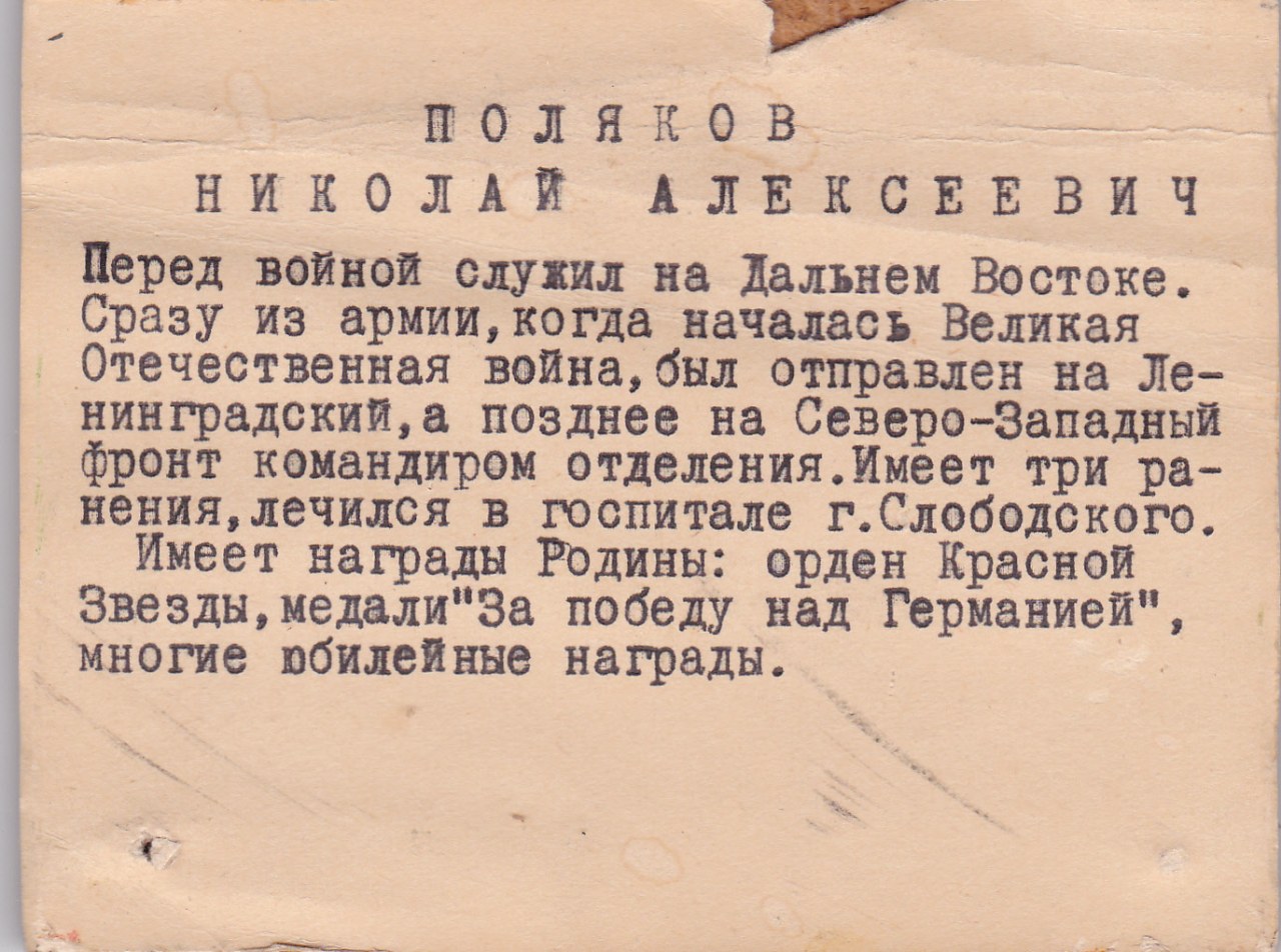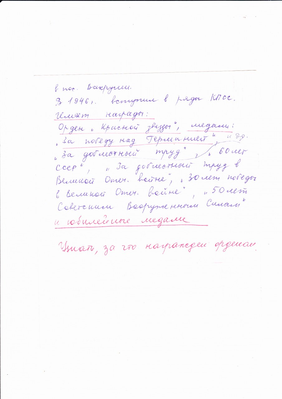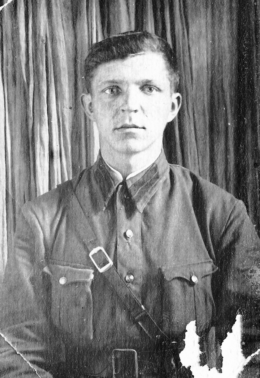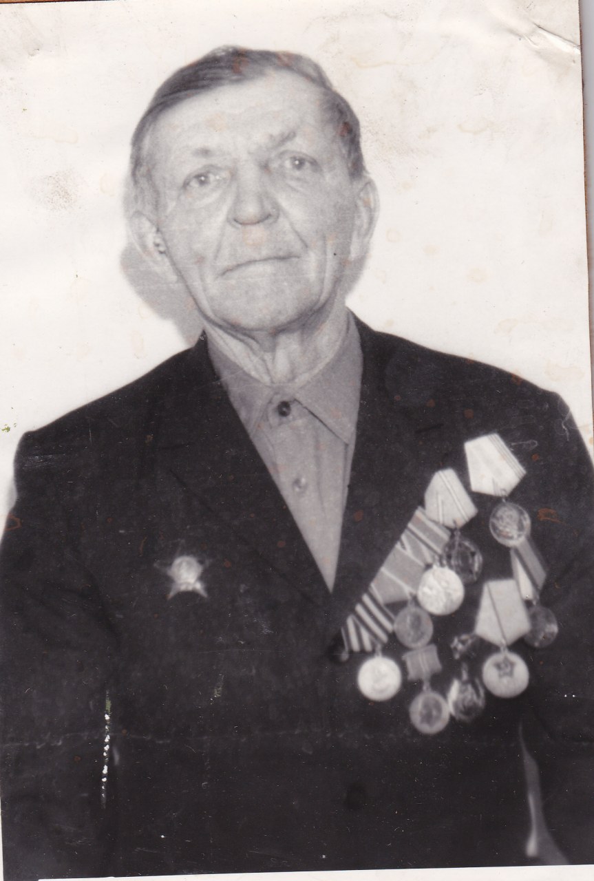 Из альбома: «Старший сержант, участник Великой Отечественной войны. Был на Северо-Западном фронте, сражался под городом Старая Русса. Во время сражений был трижды ранен. За проявленную смелость и отвагу был не раз награждён орденами и медалями. Имеет орден Красной звезды, медаль «За победу над Германией». В мирное время награждён медалью «За доблестный труд»