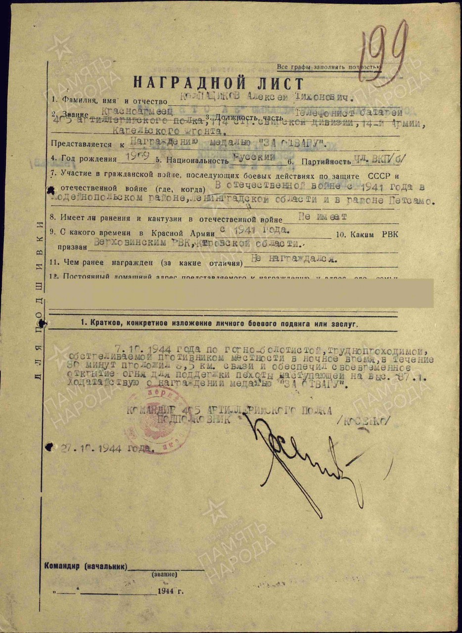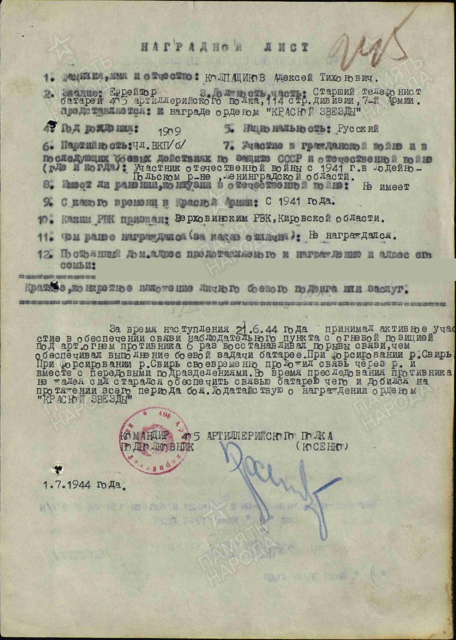 Воинская часть: 405 ап 114 сд 14 А Карельского фронта