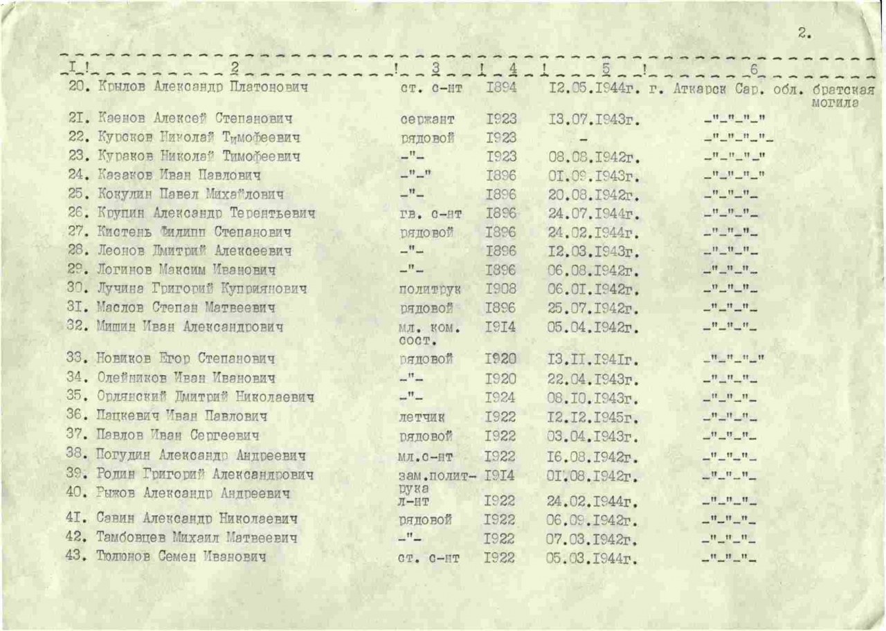 | 4314081022 | КАЗАКОВ Иван Павлович | 1896 г. р., из г. Кирова, красноармеец, 01.09.1943 года умер от болезни в ЭГ. Захоронен в Саратовской области, г. Аткарск. | Кировская область, Юрьянский район |