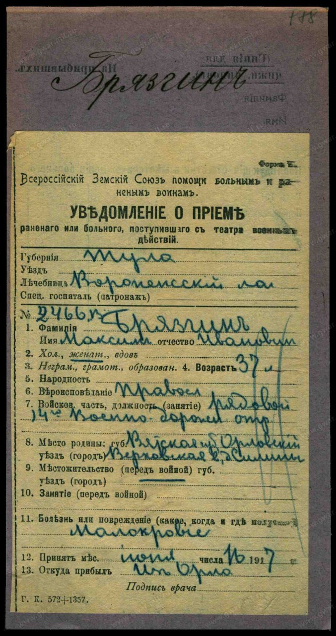| Первая мировая война | 1914 - 1918 | Должность/Звание рядовой Воинская часть 14-й Военно-дорожн. отр. Место рождения Вятская губ., Орловский уезд, Верховская вол., починок Силины Причина выбытия болен Дата события 16.06.1917 Тип документа Карточка на прибывших (высшие чины) Архив Российский Государственный Военно-исторический архив Фонд Картотека бюро учета потерь в Первой мировой войне (офицеров и солдат) Шкаф без номера Ящик 461-Б | |