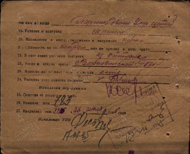 Военно-пересыльный пункт: Военно-пересыльный пункт Кировского областного военкомата, Кировская обл.Выбытие из воинской части: 26.07.1945