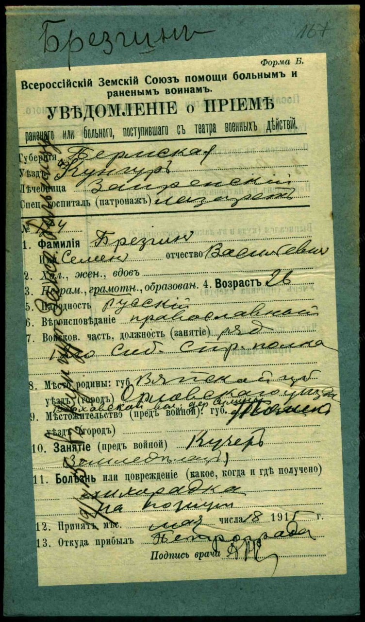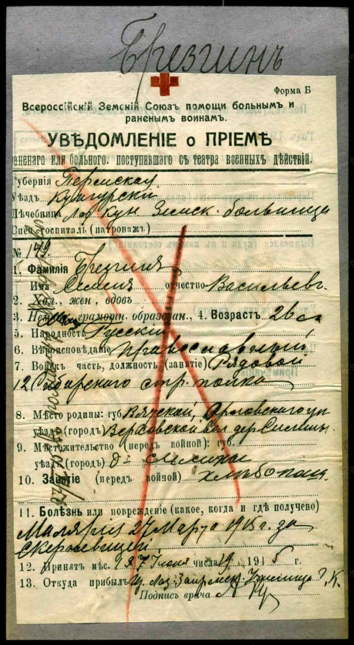 | Первая мировая война | 1914 - 1918 | Должность/Звание рядовой Воинская часть 12-й Сибирский стрелковый полк Место рождения Вятская губ., Орловский уезд, Верховская вол., д. Силины Причина выбытия болен Дата события 18.05.1915 Тип документа Уведомление о приеме раненого Архив Российский Государственный Военно-исторический архив Фонд Картотека бюро учета потерь в Первой мировой войне (офицеров и солдат) Шкаф без номера Ящик 333-Б Должность/Звание ефрейДолжность/Звание ефрейтор Воинская часть 12-й Сибирский стрелковый Его Императорского Высочества Наследника Цесаревича Великого Князя Алексея Николаевича полк Причина выбытия пропал без вести Место выбытия г.дв. Катериненгоф Дата события 03.07.1916 Тип документа Именные списки потерь Архив Российский Государственный Военно-исторический архив Фонд №16196, Особое делопроизводство по сбору и регистрации сведений о выбывших за смертью или за ранами, а также пропавших без вести воинских чинах, действующих против неприятельских армий (1914 - 1918) Опись №1, Именные списки потерь солдат и офицеров 1 мировой войны 1914-1918 гг. (по полкам и бригадам) Дело №760, Именные списки потерь солдат 12 Сибирского стрелкового полка Документ №3277, Список воинских чинов 12 Сибирского стрелкового Его Императорского Высочества Наследника Цесаревича полка убитых, пропавших без вести и взятым в плен неприятелем, а также раненых и контуженных, с 1 июля по 15 июля 1916 года, Автор: 12-й Сибирский стрелковый Его Императорского Высочества Наследника Цесаревича Великого Князя Алексея Николаевича полк, 1916-07-17 | |