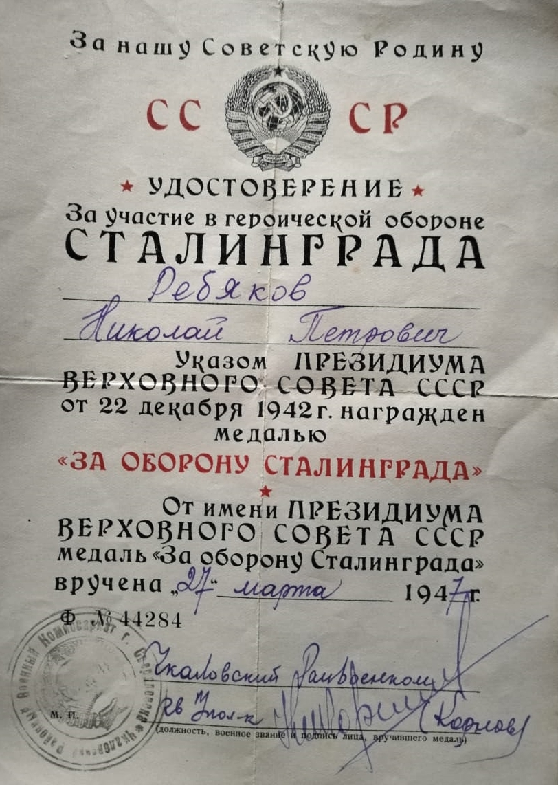 | Награждён: Медаль За победу над Германией в ВОВ 1941 -1945 гг | 27.09.1945 | ||