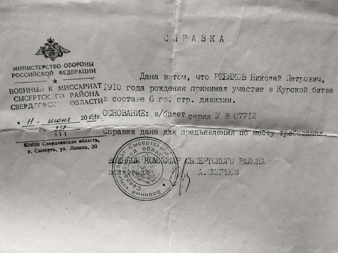 | Призван в РККА | 08.01.1942 | Арамильским РВК Свердловской области Арамильского района | |