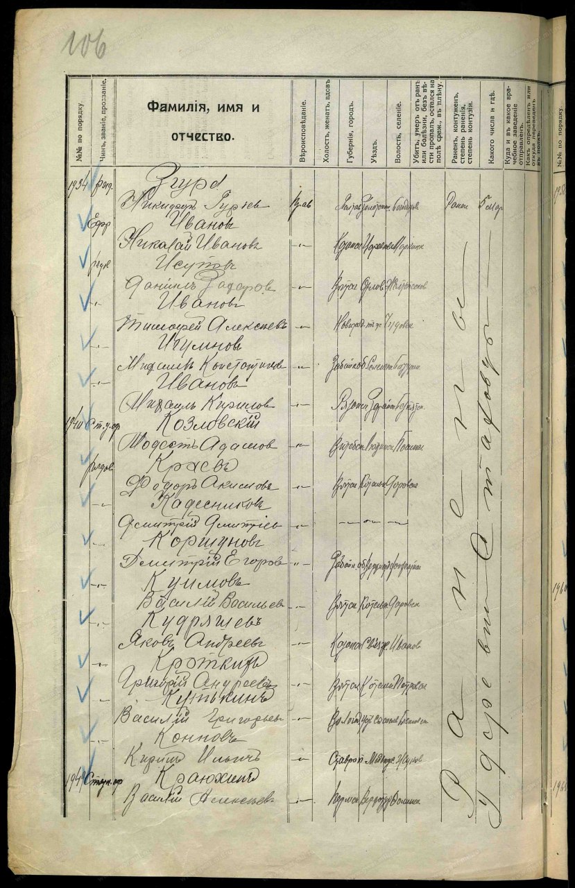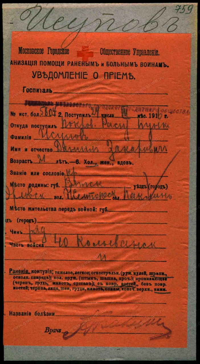 | участие в Первой Мировой войне | 1914 - 1918 | Должность/Звание рядовой Воинская часть 40-й пехотный Колыванский полк Место рождения Вятская губ., Орловский уезд, Желтопесковская вол. Причина выбытия ранен/контужен Место выбытия д. Стаховцы Дата события 05.03.1916 Тип документа Именные списки потерь Архив Российский Государственный Военно-исторический архив Фонд №16196, Особое делопроизводство по сбору и регистрации сведений о выбывших за смертью или за ранами, а также пропавших без вести воинских чинах, действующих против неприятельских армий (1914 - 1918) Опись №1, Именные списки потерь солдат и офицеров 1 мировой войны 1914-1918 гг. (по полкам и бригадам) Дело №113, Именные списки 40 пехотного Колыванского полка о потерях солдат на фронтах Документ №138139, Список воинских чинов 40 пехотного Колыванского полка убитых, пропавших без вести и взятых в плен неприятелем, а также раненых и контуженных с 11 февраля по 16 апреля 1916 г., Автор: 40-й пехотный Колыванский полк, 1916-07-26 Должность/Звание рядовой Воинская часть 40-й пехотный Колыванский полк Место рождения Вятская губ., Орловский уезд, Желтопесковская вол., починок Паклинок Причина выбытия ранен/контужен Дата события 24.03.1916 Тип документа Уведомление о приеме раненого Архив Российский Государственный Военно-исторический архив Фонд Картотека бюро учета потерь в Первой мировой войне (офицеров и солдат) Шкаф без номера Ящик 1344-И | |