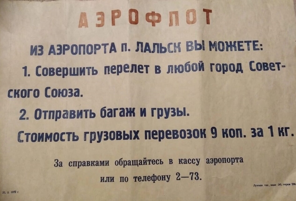 В Лальском краеведческом музее сохранился плакат о возможностях совершить перелет из аэропорта Лальска в любой город СССР, куда летали самолеты, а также отправить багаж и грузы. Стоимость перевозки 1 кг груза в то время составляла 9 копеек. Плакат был отпечатан 16 марта 1979 года в Лузской типографии (фото 4, предоставлено Лальским краеведческим музеем).