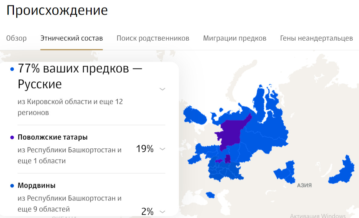 То, что тест показывает 77% русских, это ожидаемо. По генеалогическому древу, построенному по архивным данным, где некоторые корни идут вглубь веков до 14 поколения, все мои предки русские ясашные и удельные крестьяне Вятской и Пермской губерний. Откуда приехали в Вятскую губернию мои предки, известно только по роду Бобылевых, из Вологодской губернии. Интерес представляет 19% татар и 2% мордвинов.