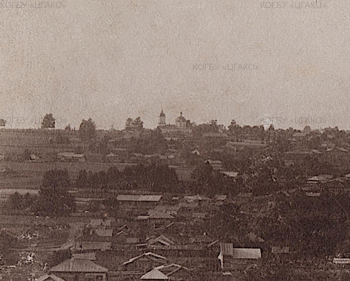 Снимок сделан с точки несколько западнее Казанского тракта, от небольшого кладбища, находившегося юго-западнее современного перекрестка ул. Ленина и ул. Тимирязева. Несмотря на дальность расстояния, благодаря малоэтажной застройке и своему расположению на вершине холма, Ахтырская церковь неплохо просматривается на снимке [ЦГАКО].
