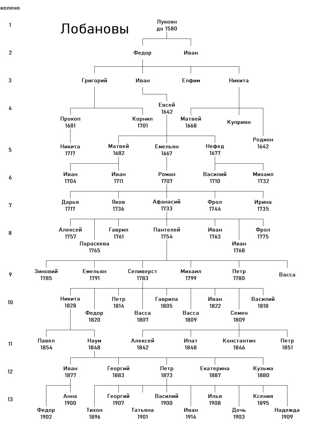 Пантелеймон Афанасьев сын Лобанов 58 лет Жена его Ефимия Степановна 53 года Дети их Селиверст 24 года Жена его Матрона Арефанова 27 Зиновий 21, Емельян 15, Михаил 7 У Селиверста сын Гаврил 2 Вдова Ирина, Гаврилова жена, Лобанова 45 У нее дети Лаврентий 16, Феодора 14, Павел 10, Дарья 11, Вера 3. |