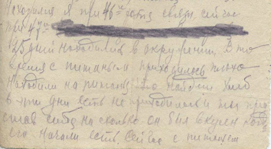 Находился я при 46-й роте связи сейчас при 47 (далее слов 5 заретушировано). 25 дней находились в окружении. В то время с питанием приходилось плохо. Находили на питание что найдешь. Хлеб в эти дни есть не приходилось и ты представь себе насколько он был вкусен когда его начали есть. Сейчас с питанием ничего нормально.