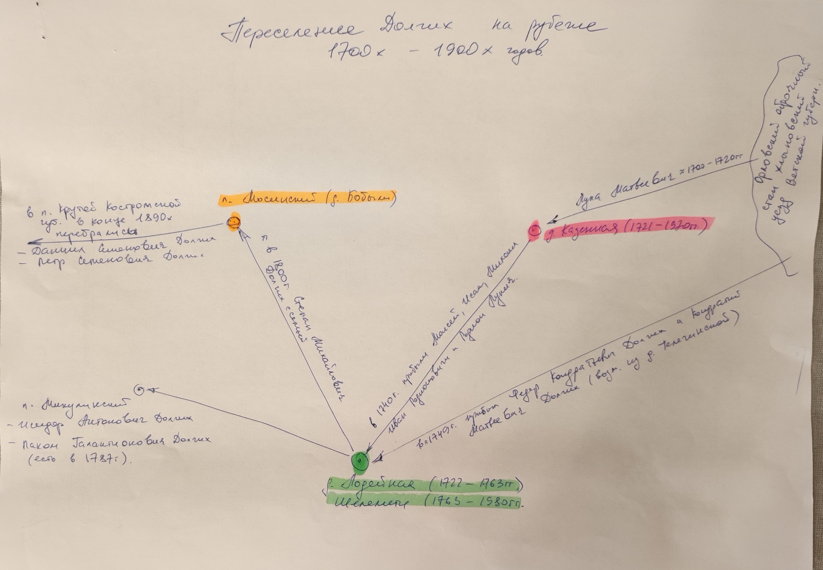 Уверен, что наши с вами Долгих точно связаны и связь уже где-то рядом, просто пока это на уровне догадок. Ну ничего, мы обязательно ее найдем! Случайности в жизни бывают, но в этом случае думаю это не случайно. Скорее всего кто-то из семьи переехал, а потом позвал с собой остальных. Приложу схему, которую начертил на "коленке", переселения моих Долгих, как я ее вижу.
