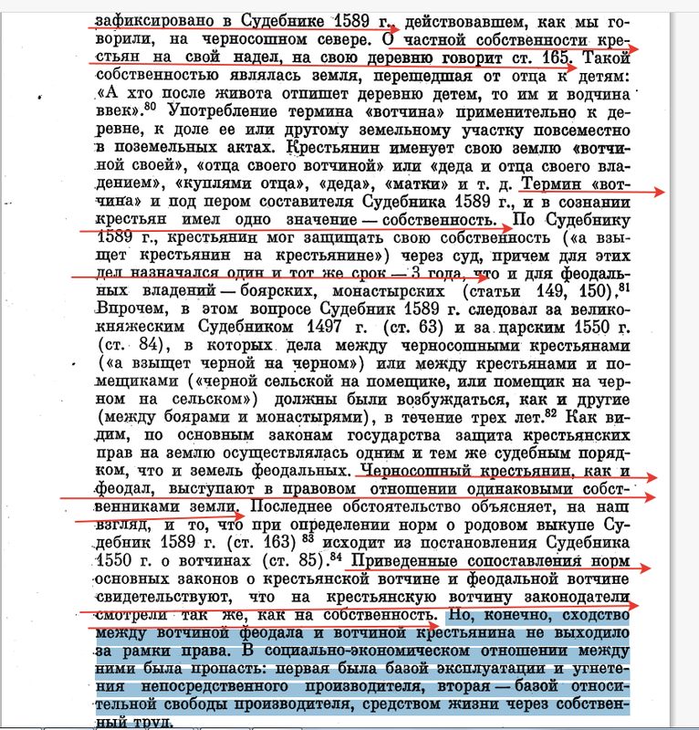 "Довольно четко просматривается тенденция когда-то совершенная купля, переходящая к потомкам, становится вотчиной. Вотчина крестьян не идентична феодальной вотчине, ее следует понимать только, как наследственное владение семьи. " (с)