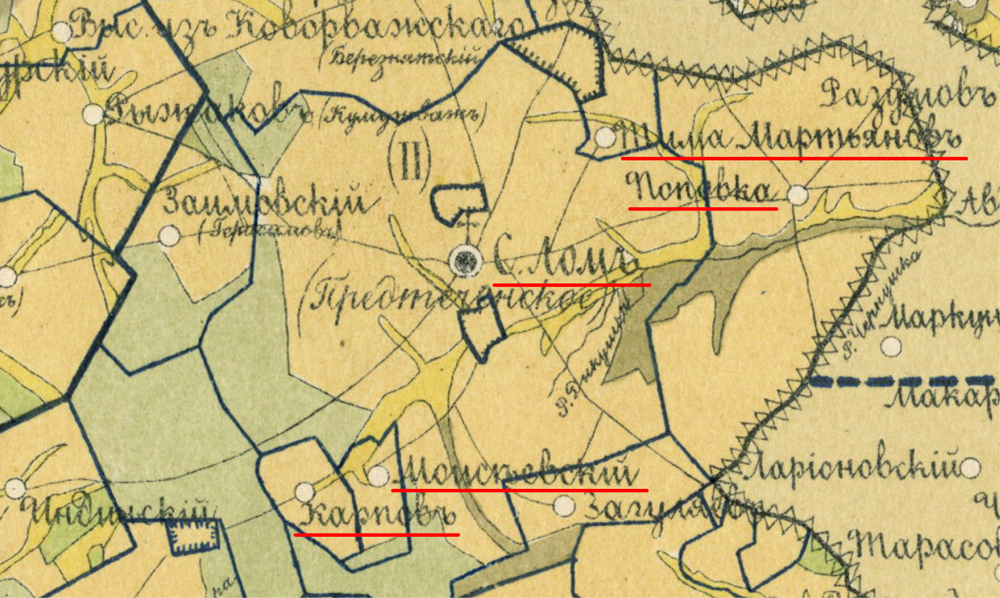 Эти починки можно обнаружить на карте Яранского уезда Вятской губернии за 1891 год с сайта Старинные карты Российской Империи. К югу-западу от села Лом находятся населенные пункты Моисеевский и Карпов, а к северо-востоку - Тима Мартьянов. Со временем починок Мосеев/Моисеевский стал деревней Мосеичи. Причем, еще одна деревня с таким же названием Мосеичи находилась километрах в 12-13 на юго-запад от Яранска. Починок Карпов стал деревней Карпычи, а Тима Мартьянов - это другое название починка при речке Крутой.