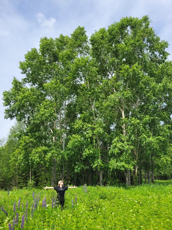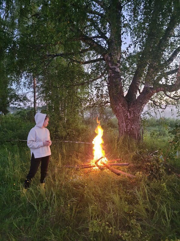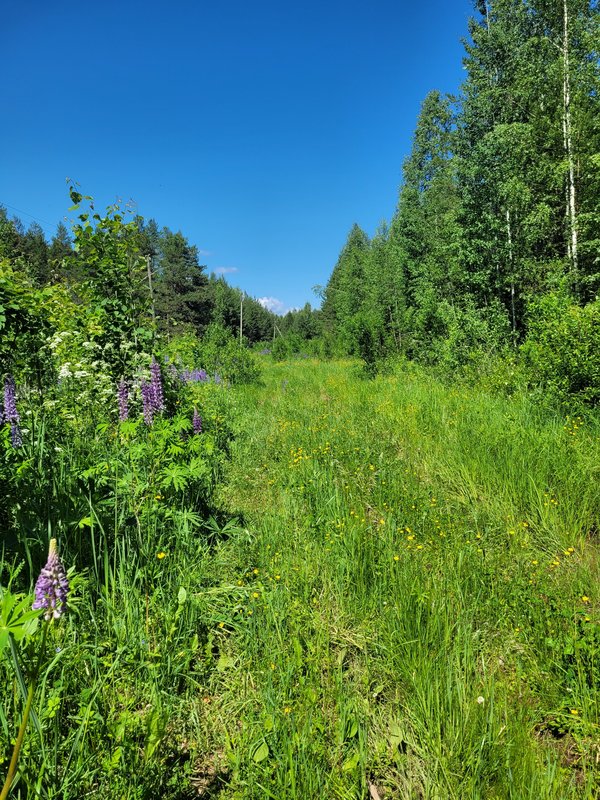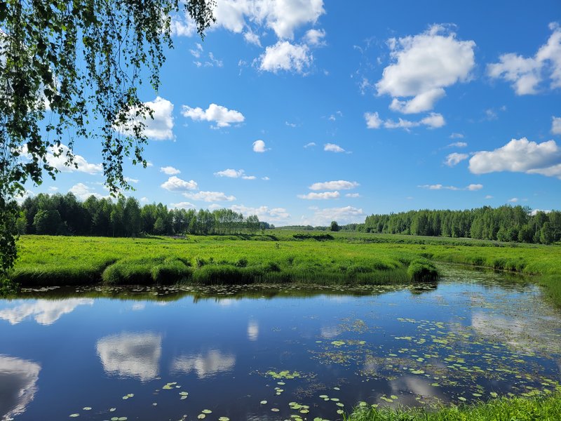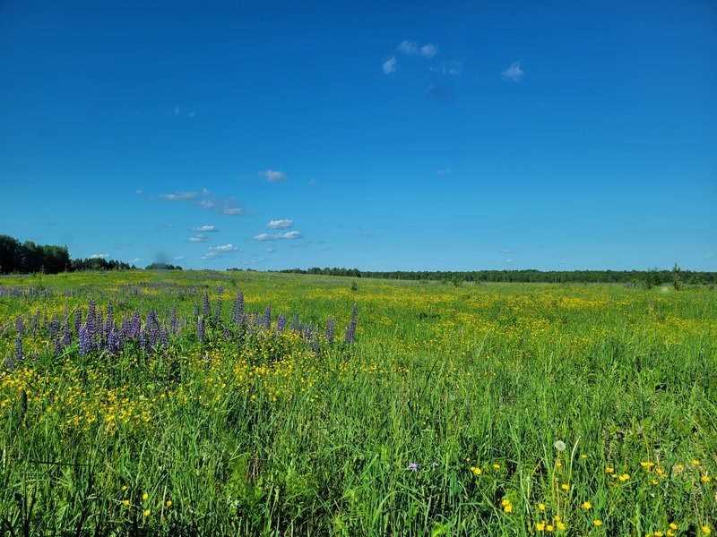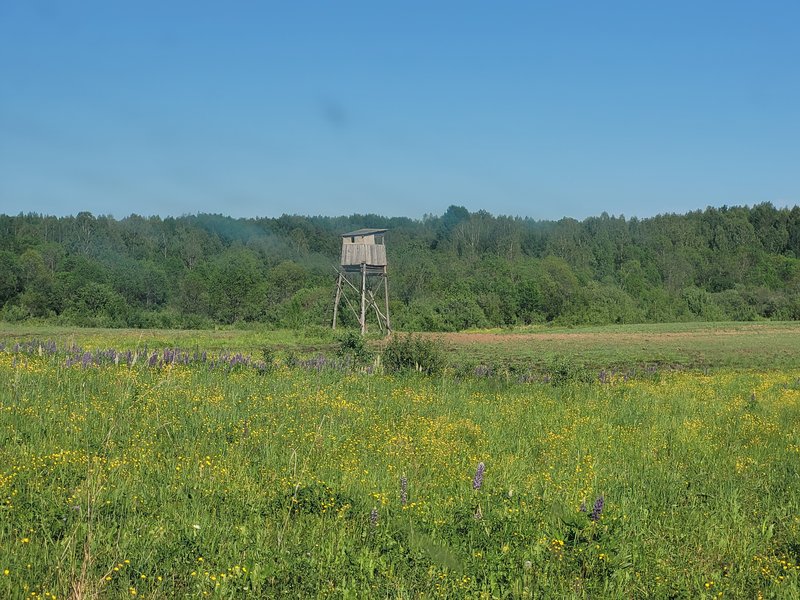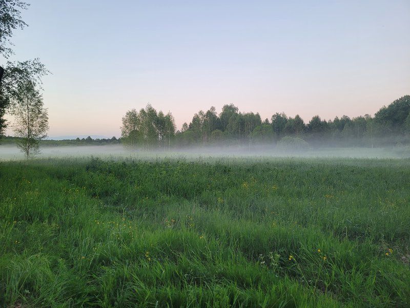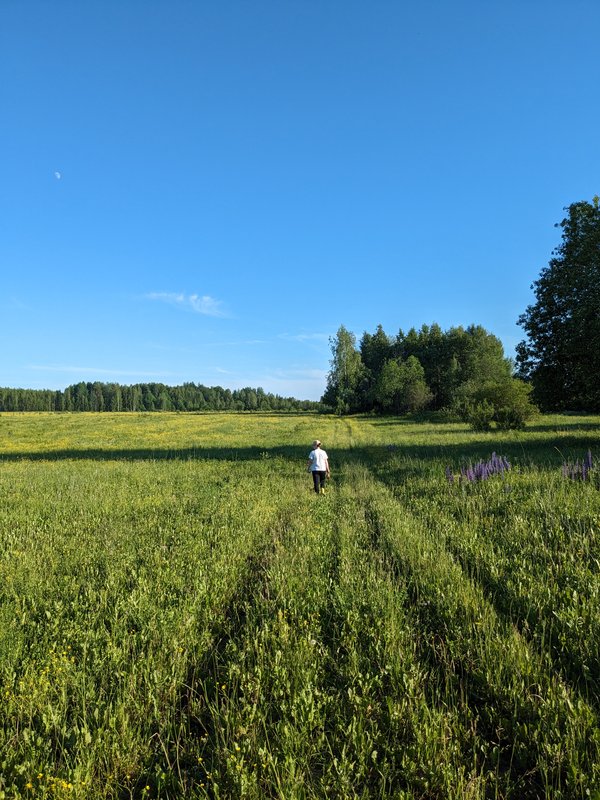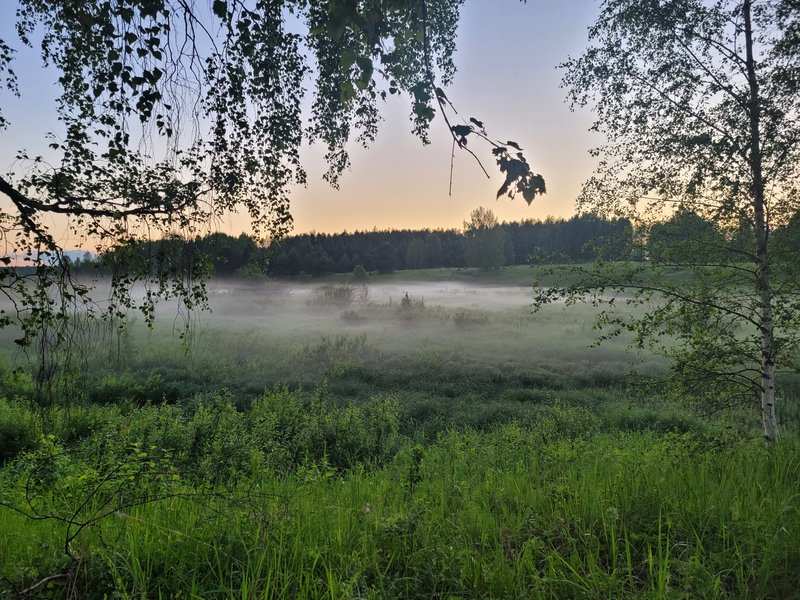 Утром мы собрали наш мини-лагерь, не стали только сдувать мой матрас, лодки то у нас не было, я плаваю очень плохо, да и телефоны, ключи от машины не оставишь же на берегу. Решили проверить уехали ли рыбаки, если да - плывем, нет - не судьба. Их не было... Как же это было страшно до середины реки, в самом начале я даже попыталась отказаться, Андрей сказал: “Нет уж”, пару раз толкнул багром - и мы уже на середине реки. Мне потом стало смешно- нас на этом матрасе крутило по реке, смотрелось с берега, наверное, очень забавно. Хоть нам и показалось, что матрас мы где-то зацепили и его спускает, мы благополучно переправились, вышли на берег, переоделись в сухое (в моменте при отправлении нас погрузило в воду, все насквозь было сырое, кроме заветного пакета с телефонами и ключами) и пошли по направлению к месту деревни. Идти надо было по ельнику, а потом по сиреневому полю (это люпины) около 1,1 км. Жара, духота, высокая трава, повсюду “лежанки” кабанов ... все преодолели.