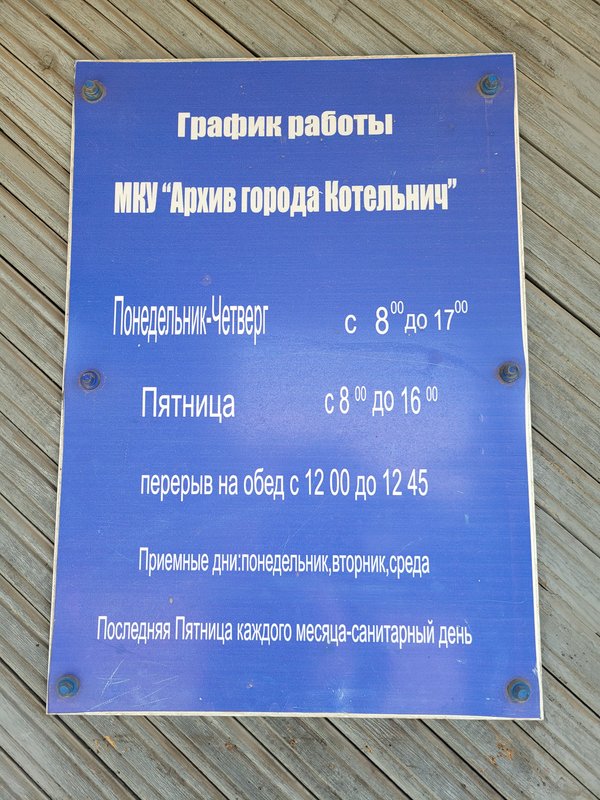 На следующий день мы утром посетили архив Котельнича (все, как и везде тут, очень дружелюбно, открыто, с улыбкой). Время работы и приема архива в Котельниче.