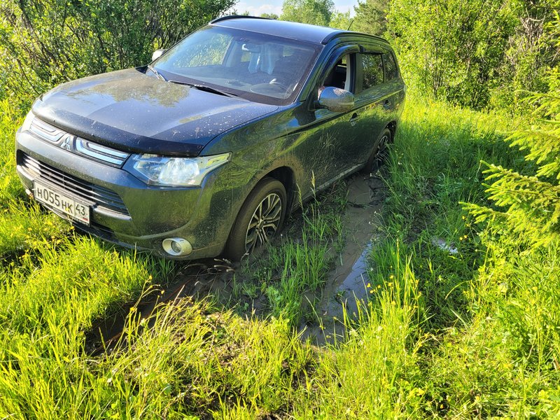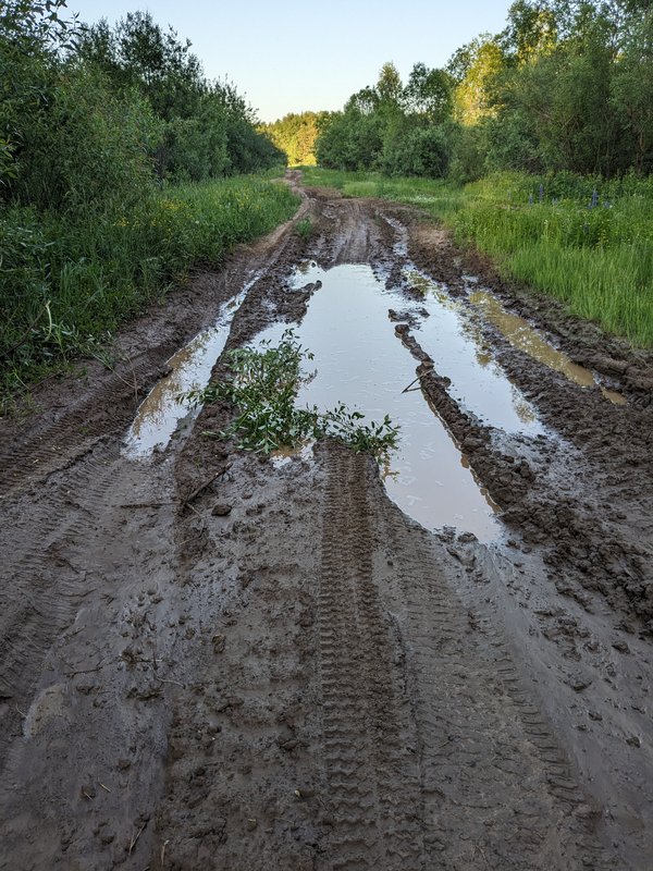 И вот, когда уже половина пути была позади, а впереди еще одна деревня - Жеребцовы и потом наконец Крестецы, в очередной яме ... мы “сели”. Андрей перепрыгивал такие ямы “с наскока” на скорости, но из этой ямы таким манером выскочить не получилось. При этом она не вызывала каких-то опасений, ничем не страшней остальных, возможно роль сыграли забитые протекторы, мы больше часа ехали почти полностью по глине. Потом я по карте посмотрела, там оказывается когда-то была река. Связи нет никакой, на улице жара, воды почти по колено. Ну что делать, стали под колеса ветки носить, благо лес рядом был, а у Андрея топор, так мы проплюхались около часа, наверное с 10й попытки машина, цепляясь из последних сил, выехала. Я все это время думала, как же мы вернемся ... Тут оставаться, было очень опасно, очень далеко от населенных пунктов, глушь и дикий лес вокруг.
