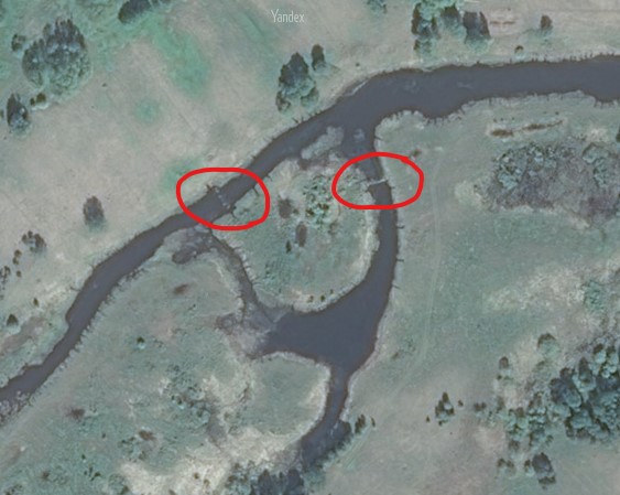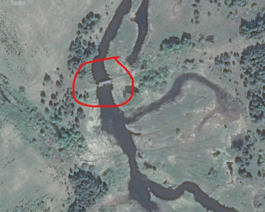 Первым вариантом был путь под кодовым названием “мост”. Чуть-чуть не доезжая до существующего н.п. Сосновка (ранее тут был льнозавод), есть V-образный перекресток на нем нам нужно было свернуть налево, максимально проехать, выйти по лесу к реке (около 700 м.), и там когда-то давным-давно был автомобильный мост через реку, по крайней мере этот мост отмечен на спутниковых картах, дальше по плану Малышевы и Крестецы (итого 1,5 км. пешком в одну сторону, допустимо). Со спутника мост выглядит так: