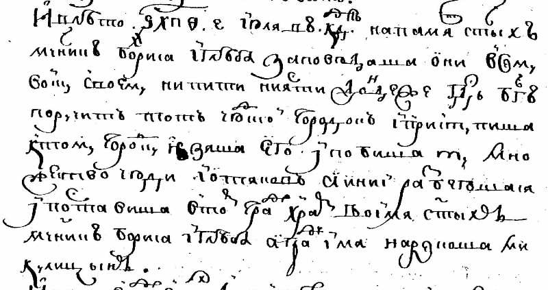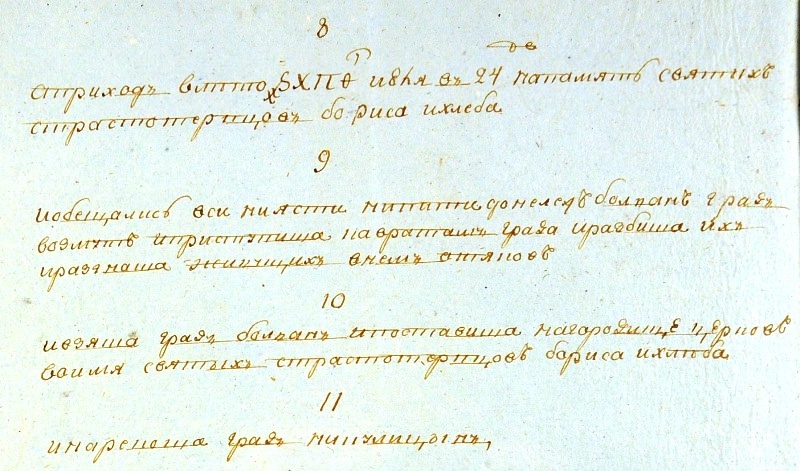 «И приступивше к тому граду вельми жестоко и сурово, призываху на помощь святых страстотерпцов Бориса и Хлеба, глаголюще: “Яко же иногда новгородцкому великому князю Александру Невскому даровали есте победу на супротивныя шведы за рекою Невою, явистеся пловуще в насаде, тако и ныне нам способствуйте молитвами вашими”. И помощию всесилнаго в Троицы славимаго Бога и предстательством Пресвятыя Богородицы, а ходатайством святых страстотерпцов великих князей Бориса и Хлеба, той крепкий град взяша воинским промыслом в лето 6689-е (1181) месяца иулия в 24 день на память их всероссийских князей святых страстотерпец Бориса и Хлеба, и побиша ту множество чюди и отяков, а инии по лесам разбегошася».