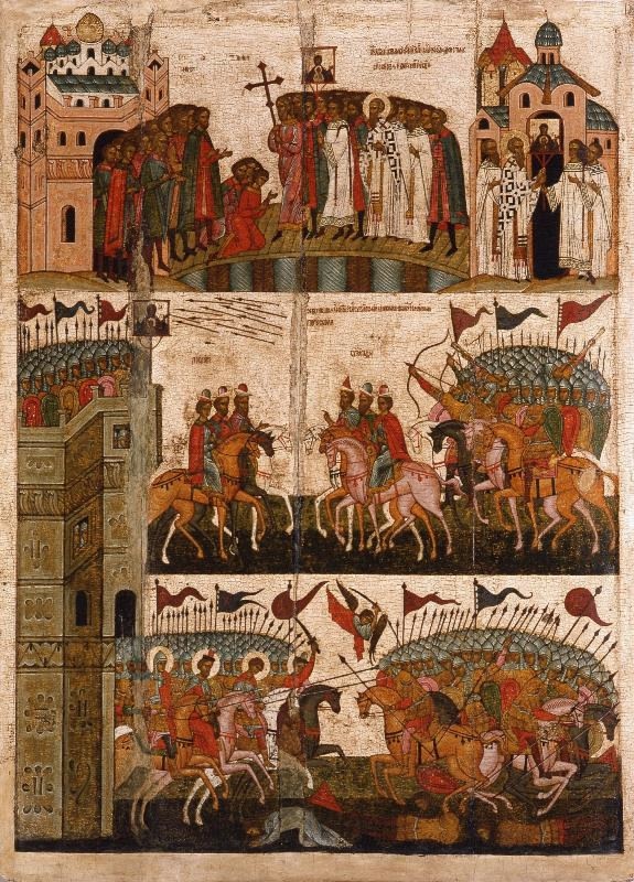 Очень важно, что это не единственный факт в русской культуре, когда Александр Невский использовался наряду со св. князьями Борисом и Глебом в качестве святого защитника, как бы, не в своё время. В 1460-х годах в Новгороде была написана икона «Битва новгородцев с суздальцами». Сюжетом для неё послужило чудо от иконы «Богоматерь Знамение», произошедшее в 1170 году во время осады Великого Новгорода войском суздальского князя Андрея Боголюбского. Икона защитила город, и неприятели были разбиты и прогнаны от города. На нижнем третьем ярусе иконы «Битва новгородцев с суздальцами» изображён момент, когда новгородское войско вышло из-за стен кремля для битвы с суздальцами.
