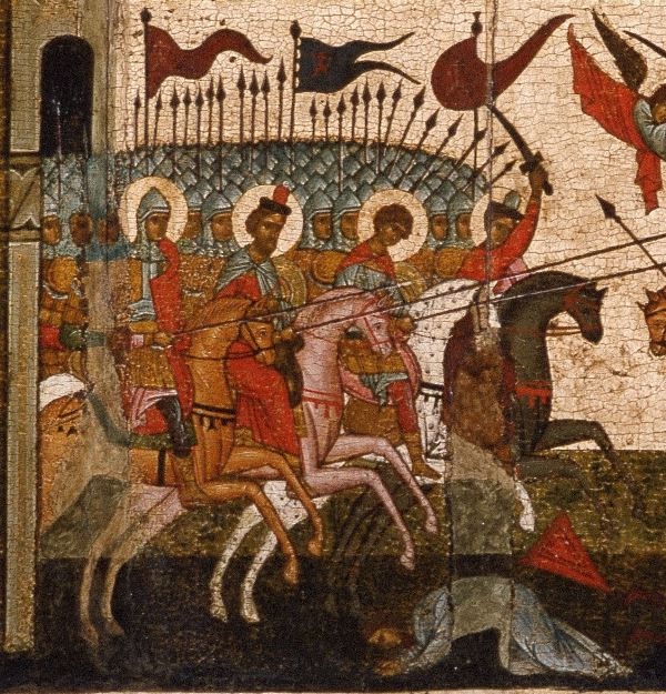 Во главе новгородского войска на конях изображены четыре святых воина. Кто же они? К сожалению, иконописец не сделал никаких надписей, которые помогли бы идентифицировать этих святых. Тем не менее, все исследователи сходятся во мнении, что двое из них – это св. великомученики князья Борис и Глеб, очень почитавшиеся в Новгороде. Ещё один святой идентифицируется как св. Георгий Победоносец, также очень почитавшийся новгородцами. И остаётся четвёртый, насчёт которого искусствоведы спорят с конца XIX века. Предлагаются три кандидатуры: св. Иисус Навин, св. Димитрий Солунский и св. князь Александр Ярославич Невский. Вообще иконография Александра Невского известна с XVI века, официально канонизирован он был также в XVI веке, поэтому данная кандидатура у некоторых исследователей вызывает сомнения. Однако с середины XV века именно в Новгороде начинается прославление и почитание Александра Невского. В последнее время кандидатура князя Александра защищается некоторыми исследователями наиболее аргументированно (можно почитать вот здесь: https://cyberleninka.ru/article/n/obraz-aleksandra-nevskogo-na-ikonah-bitva-novgorodtsev-s-suzdaltsami-xv-xvi-vv-k-probleme-identifikatsii ). Я также придерживаюсь этой точки зрения. Таким образом, скорее всего, на иконе изображены, слева направо: св. Георгий Победоносец, св. Борис, св. Глеб, кн. Александр Невский.
