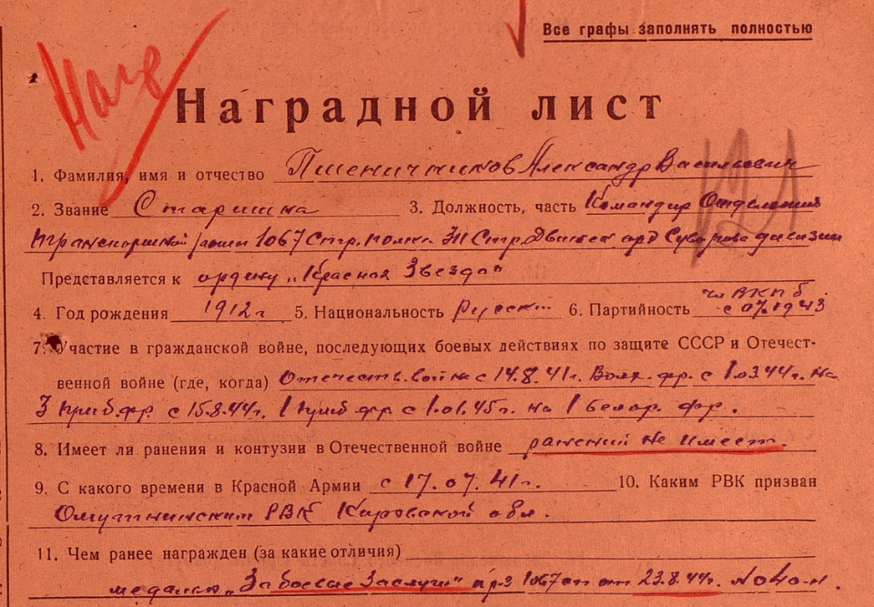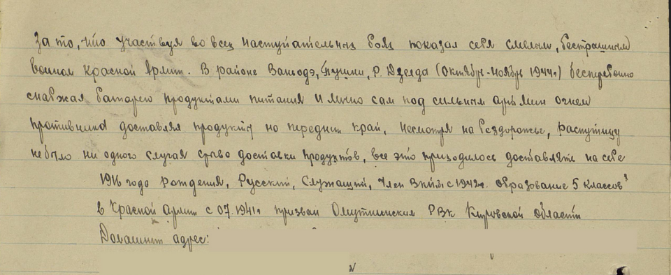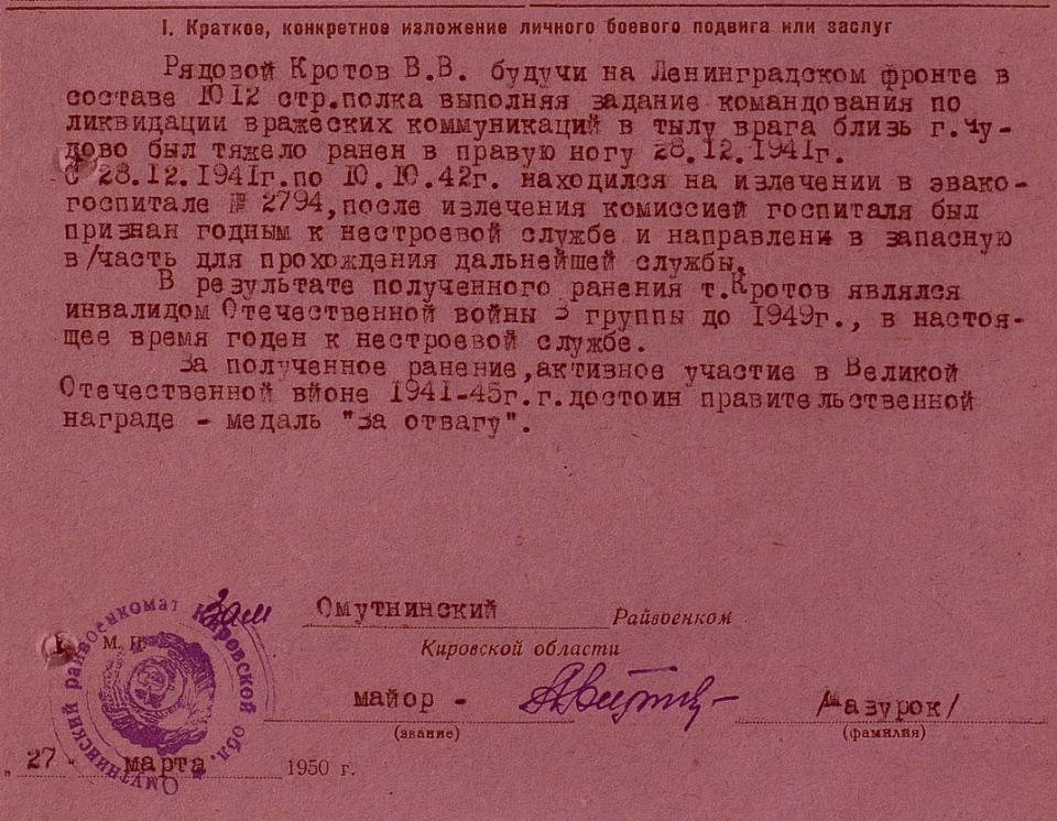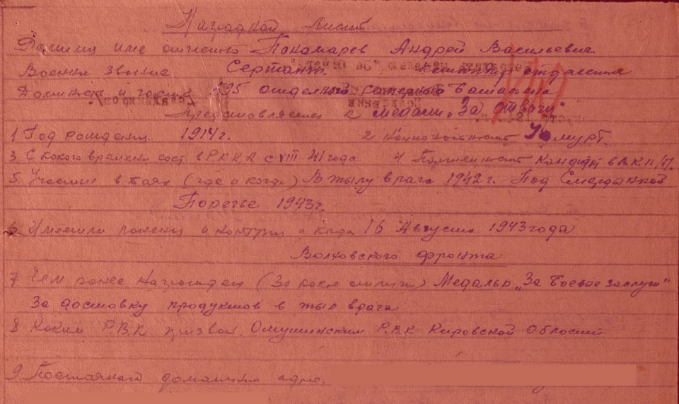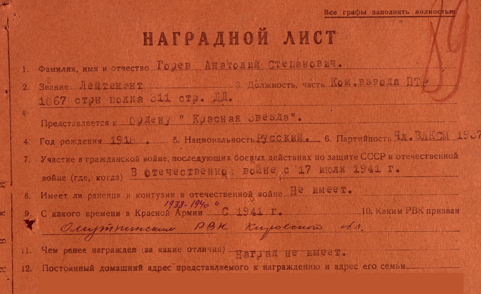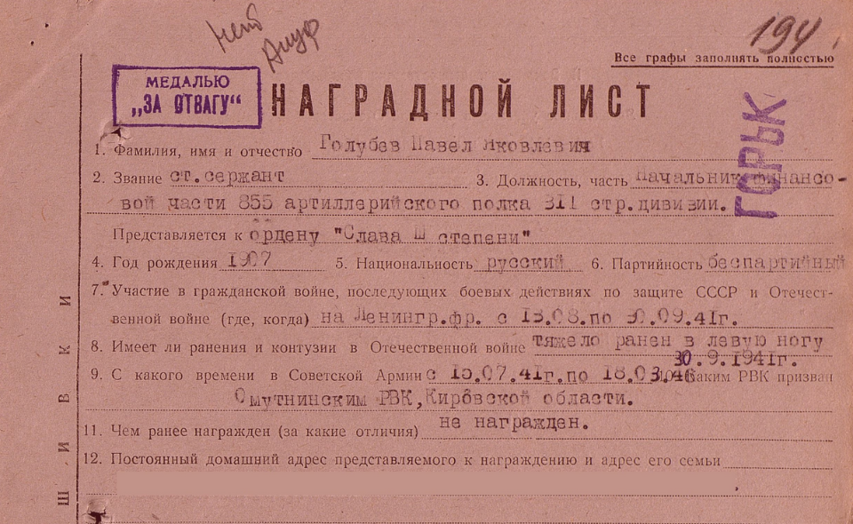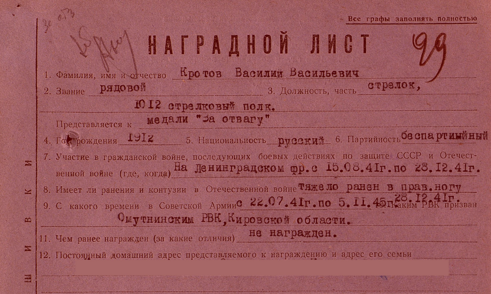 Представление на награждение медалью «За оборону Ленинграда» от 12.05.43.
