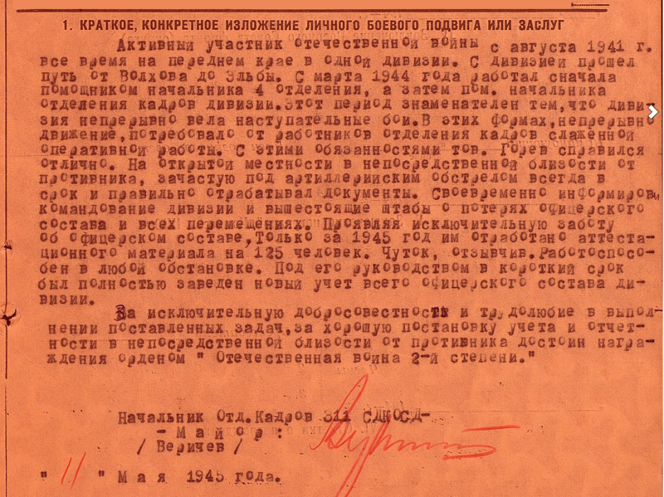 Приказ войскам 61 армии Первого Белорусского Фронта №522 от 29.05.45 о награждении орденом «Отечественной войны 2 степени»