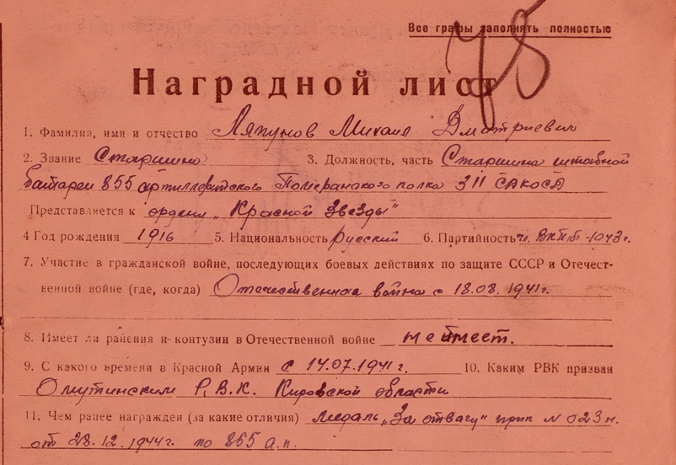 Приказ по 855 арт.полку 311 сд №23 от 28.12.44 о награждении медалью «За отвагу»