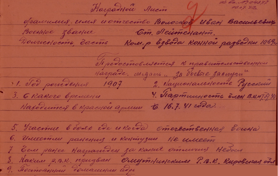 в РККА с 15.07.1941, ранение -30.08.41(Чудово)