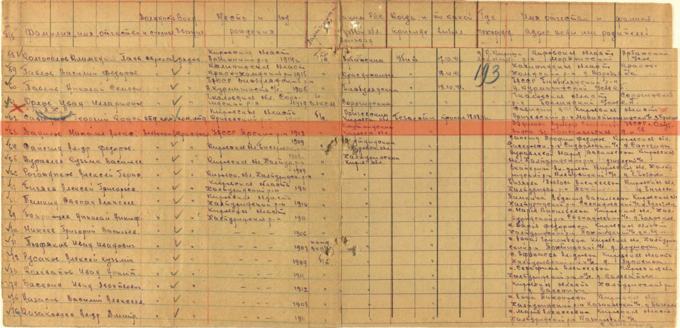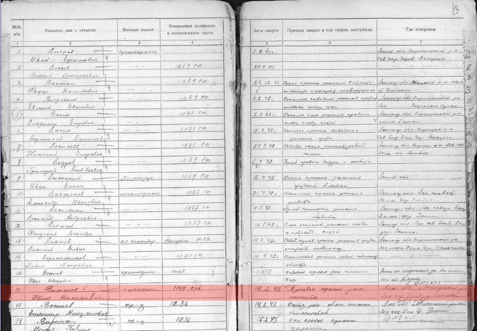 Умер от ран-14.02.43 (Алфавитная книга умерших 240 ОМСБ 311 сд)