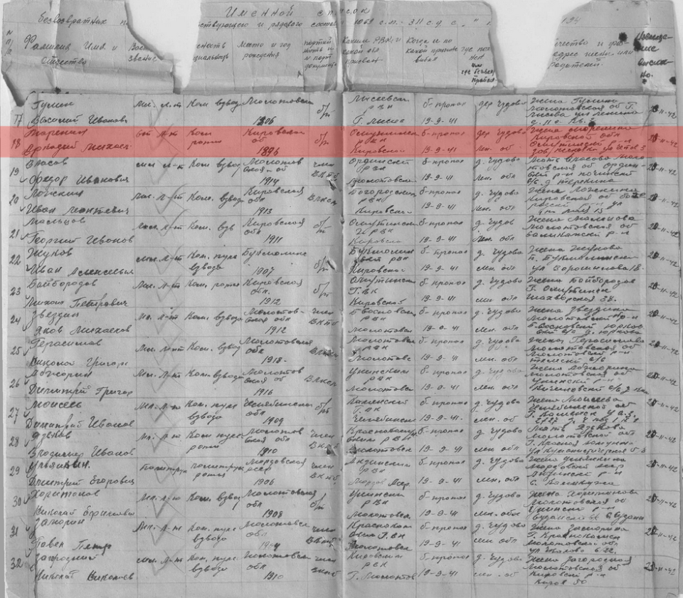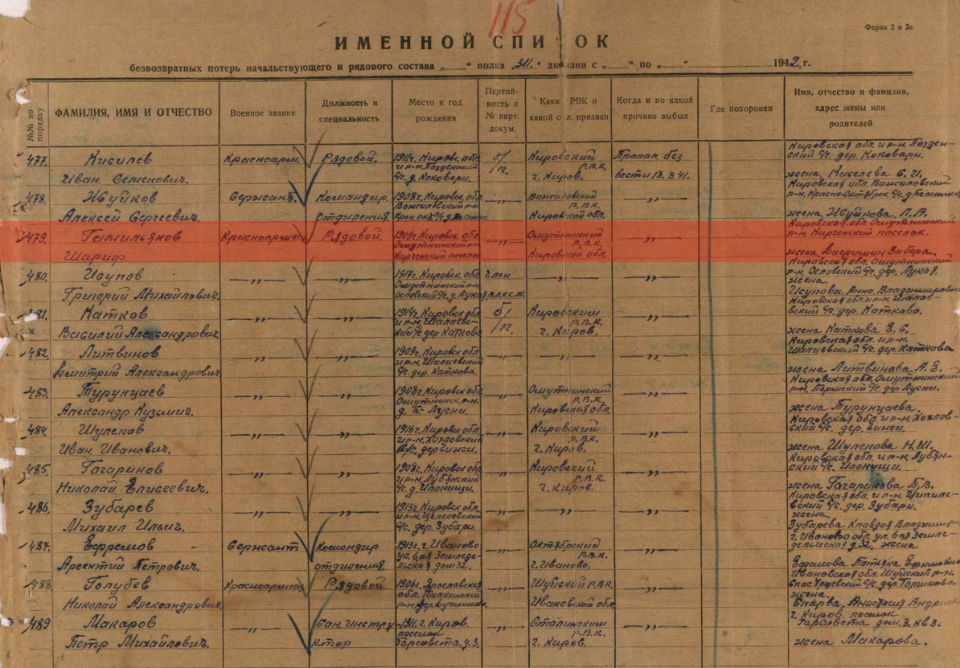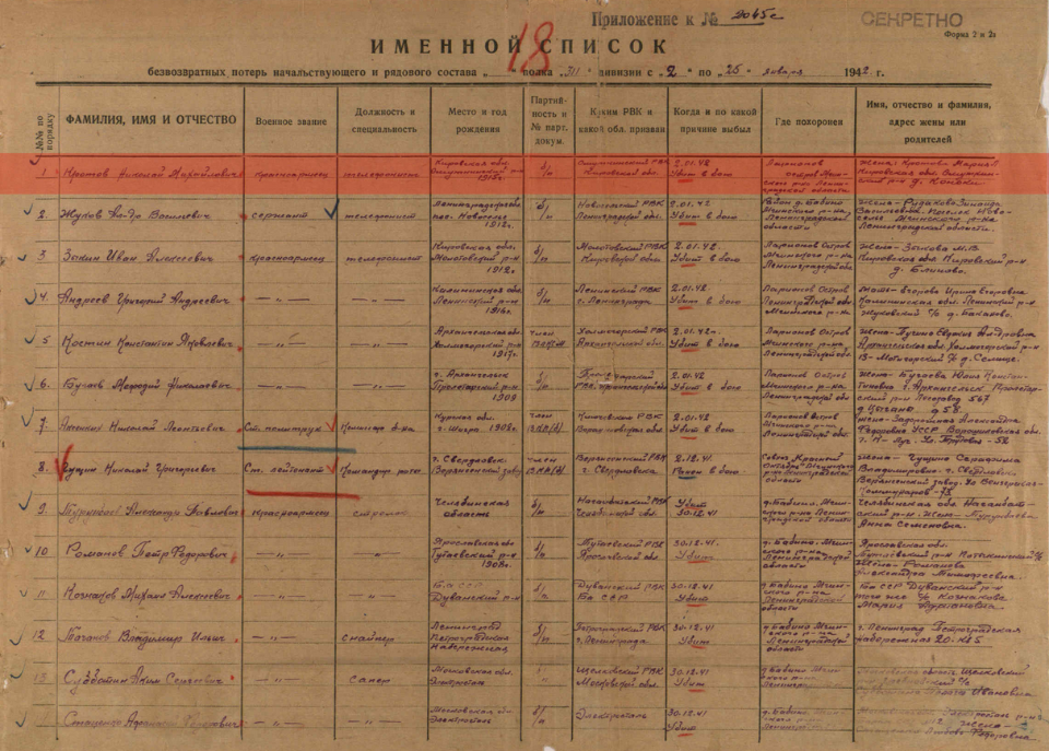 Приказ гуф и ув КА (главного управления формирования и укомплектования войск Красной Армии) об исключении из списков, донесение№1369
