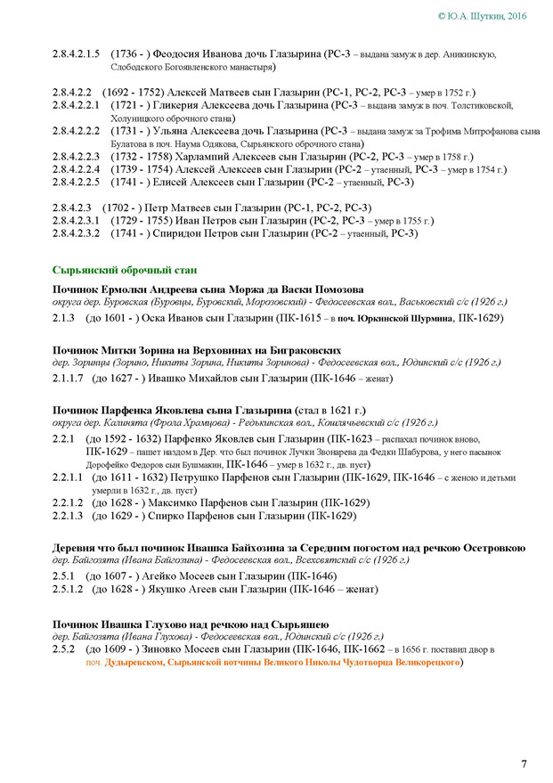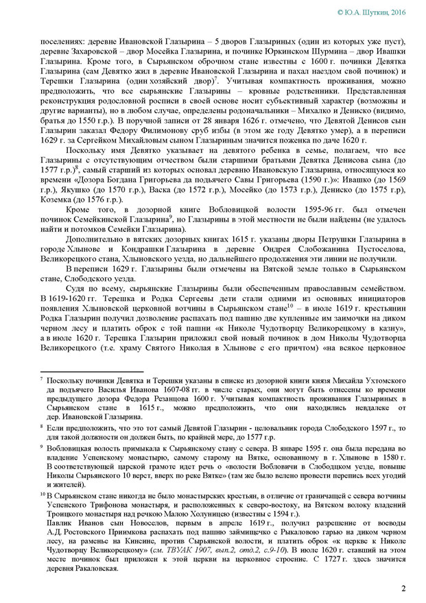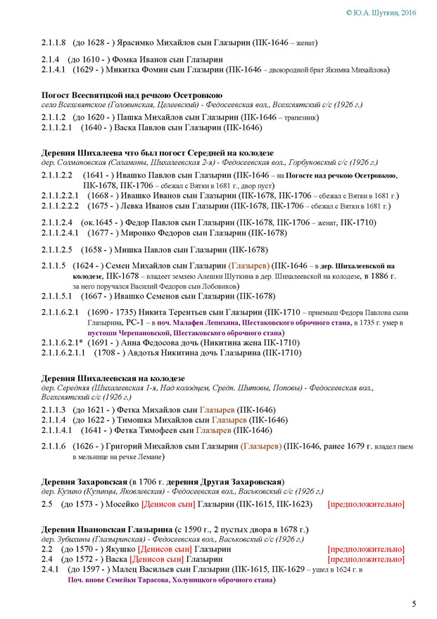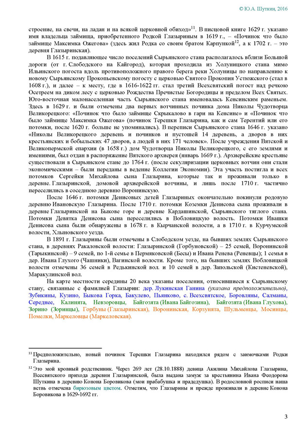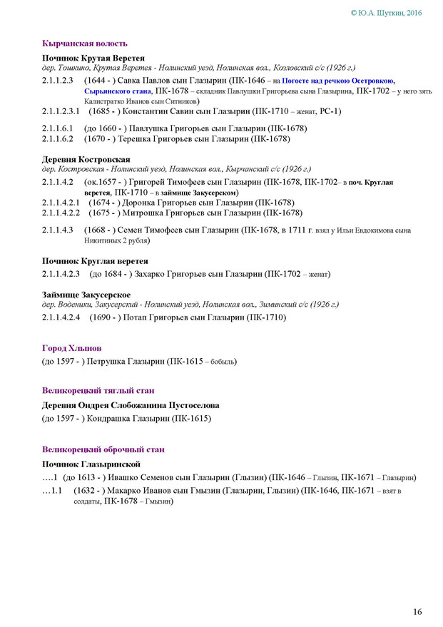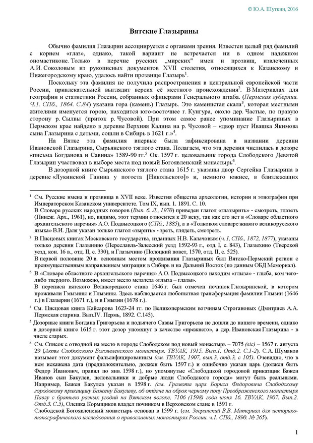 На Вятке эта фамилия впервые была зафиксирована в названии деревни Ивановской Глазырина, Сырьянского тяглого стана. Полагаем, что эта деревня числилась в дозоре «письма Богданова и Савина» 1589-90 гг.