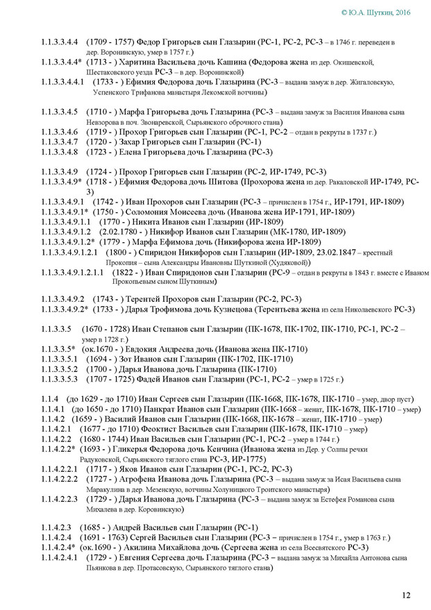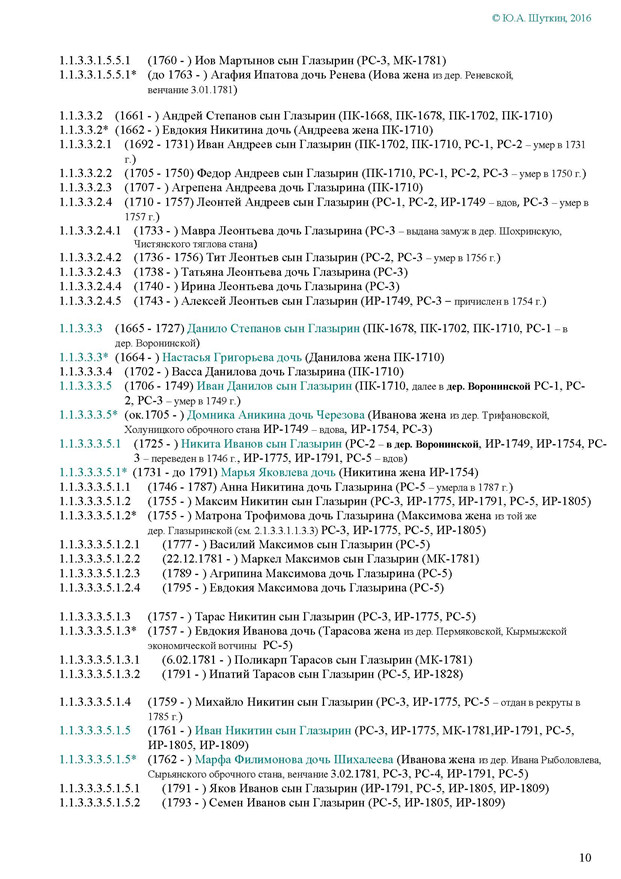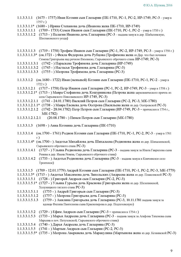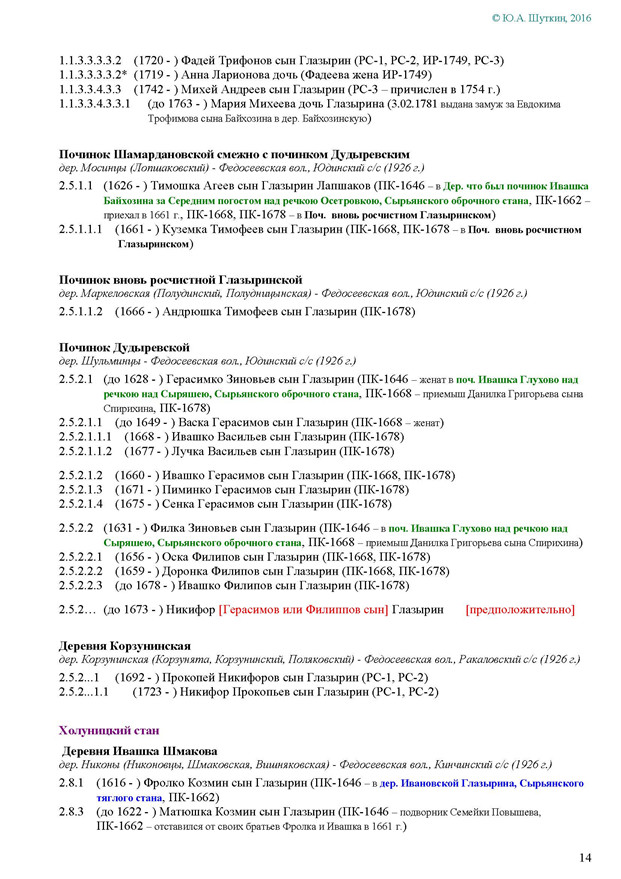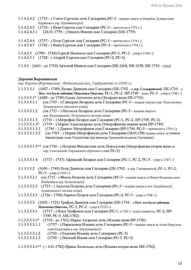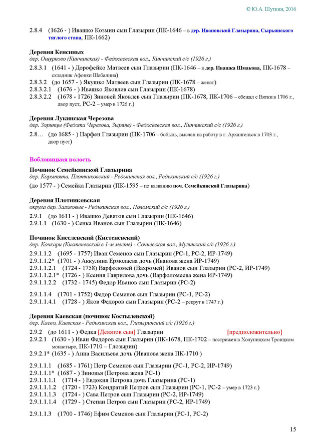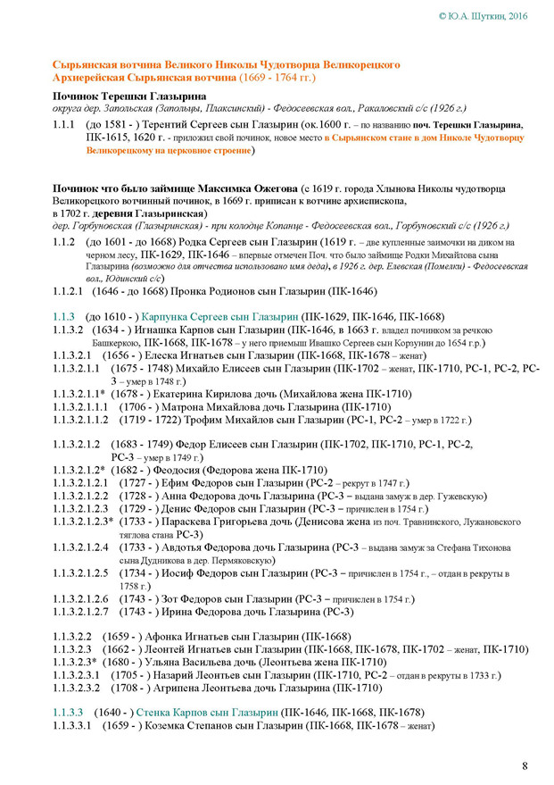 На Вятке эта фамилия впервые была зафиксирована в названии деревни Ивановской Глазырина, Сырьянского тяглого стана. Полагаем, что эта деревня числилась в дозоре «письма Богданова и Савина» 1589-90 гг.