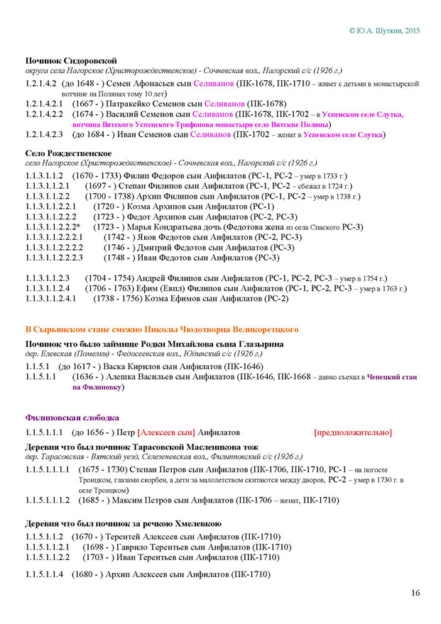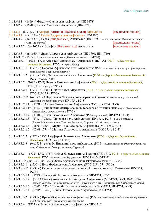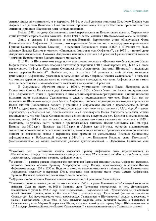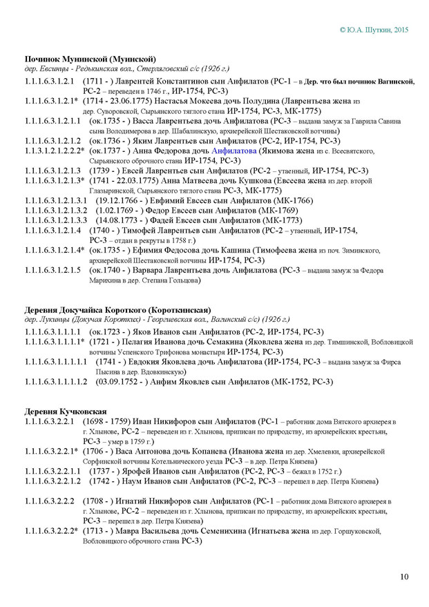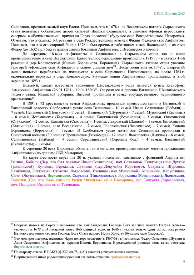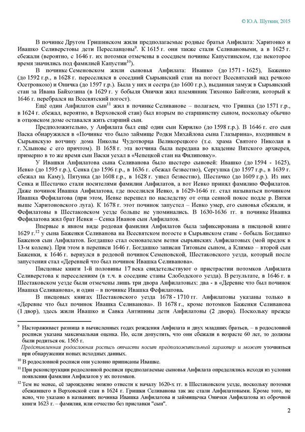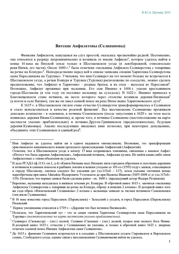 Фамилия Анфилатов, кажущаяся на слух простой, оказалась чрезвычайно редкой. Несомненно, она относится к разряду патронимических и возникла от имени Анфилат, которое удалось найти в конце 16 века на Вятской земле только в Шестаковском уезде (в левобережной, относительно реки Вятки, его части). Около 1600 г. была отмечена «мельница Анфилата Селиверстова с товарищы на речке на Кошуре». Непосредственно перед ней в списке записана «пожня Харитонка Селиверстова сына Переславцова на Турунце». Учитывая, что имя Селиверст на тот момент больше не встречается в Шестаковском уезде, а речки Кошура и Турунец (Турунка) расположены по соседству, можно сделать предположение, что Анфилат и Харитонко – родные братья, и их отец – выходец из Переславля.
