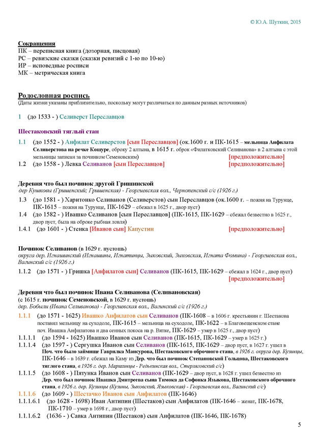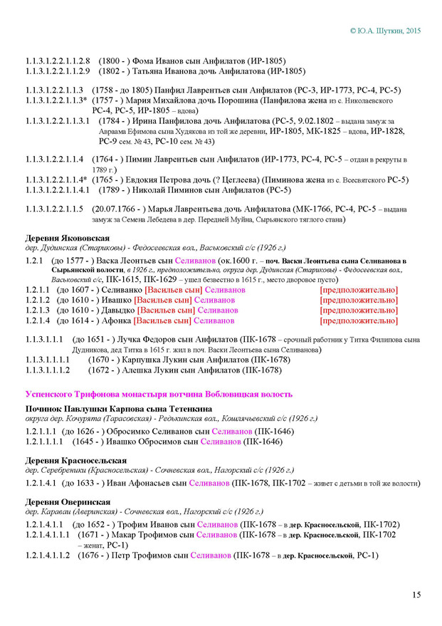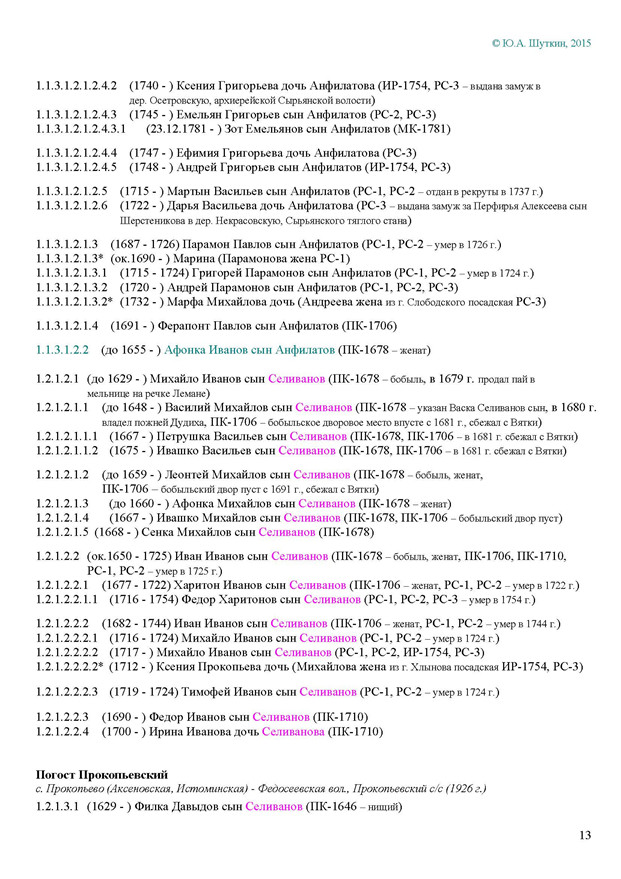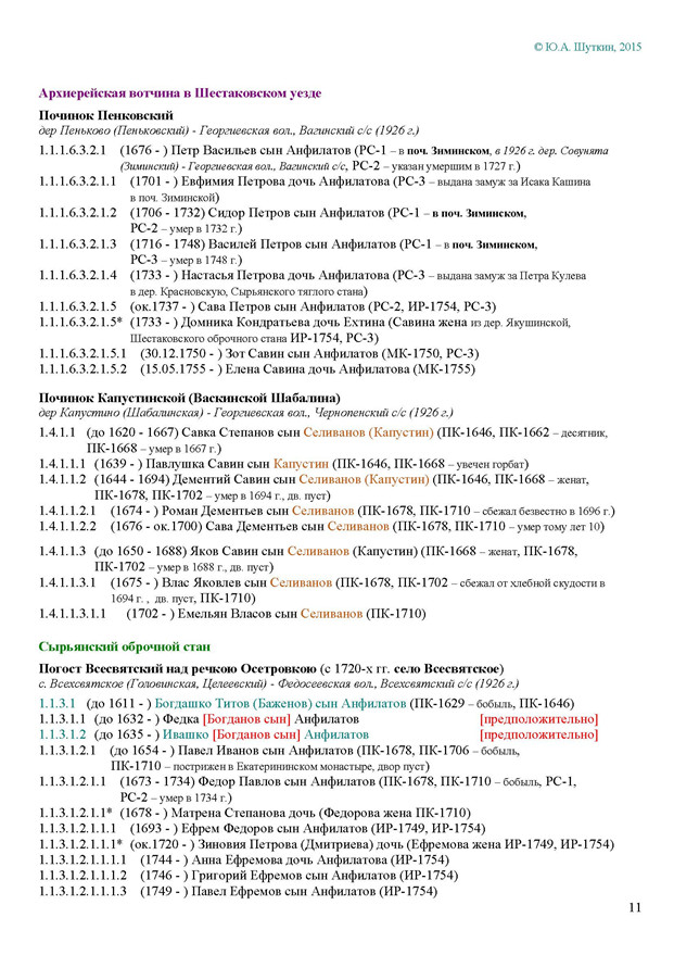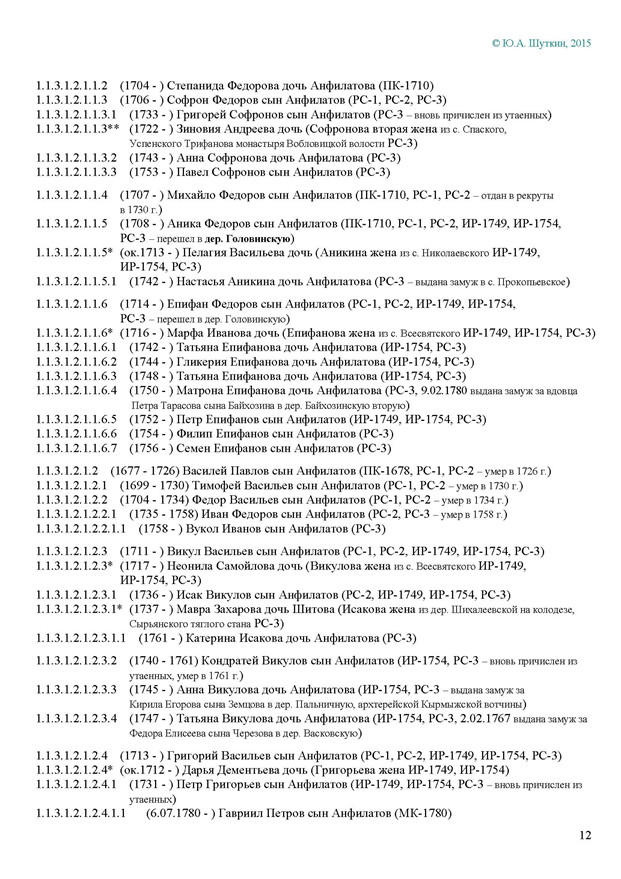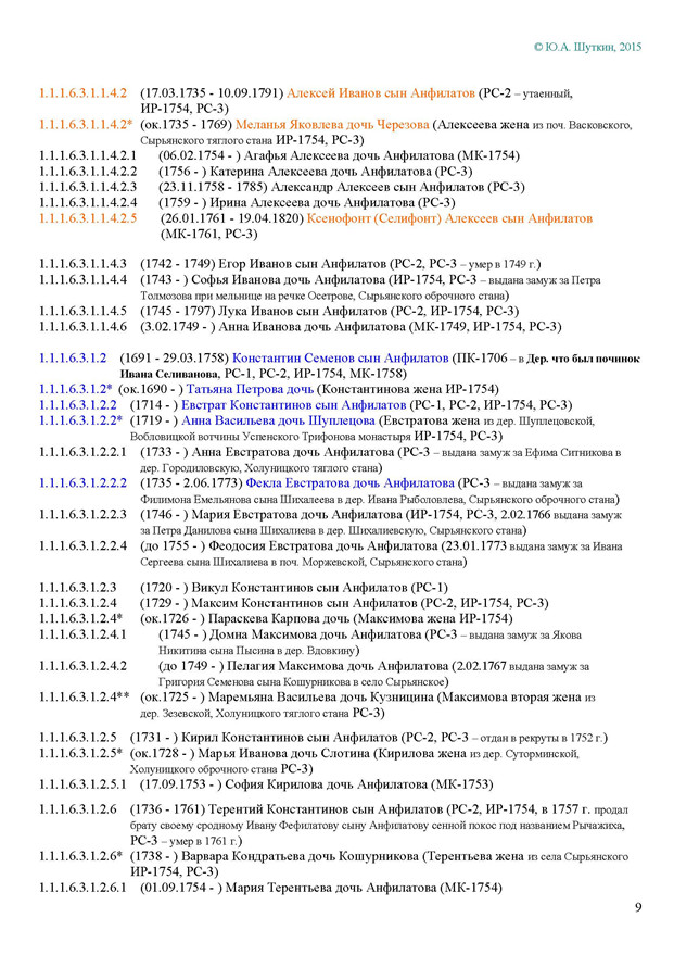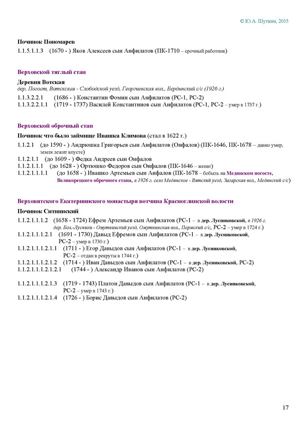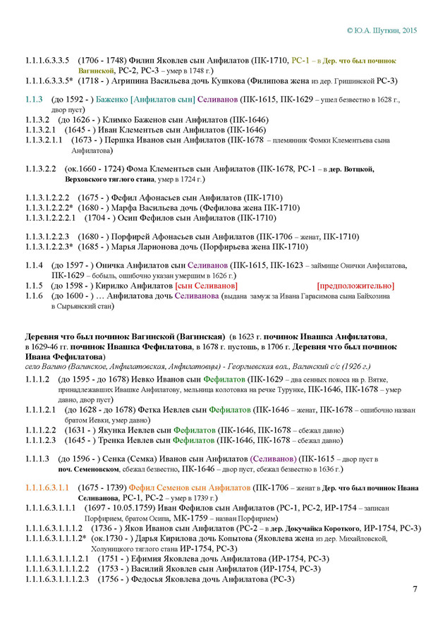 Фамилия Анфилатов, кажущаяся на слух простой, оказалась чрезвычайно редкой. Несомненно, она относится к разряду патронимических и возникла от имени Анфилат, которое удалось найти в конце 16 века на Вятской земле только в Шестаковском уезде (в левобережной, относительно реки Вятки, его части). Около 1600 г. была отмечена «мельница Анфилата Селиверстова с товарищы на речке на Кошуре». Непосредственно перед ней в списке записана «пожня Харитонка Селиверстова сына Переславцова на Турунце». Учитывая, что имя Селиверст на тот момент больше не встречается в Шестаковском уезде, а речки Кошура и Турунец (Турунка) расположены по соседству, можно сделать предположение, что Анфилат и Харитонко – родные братья, и их отец – выходец из Переславля.