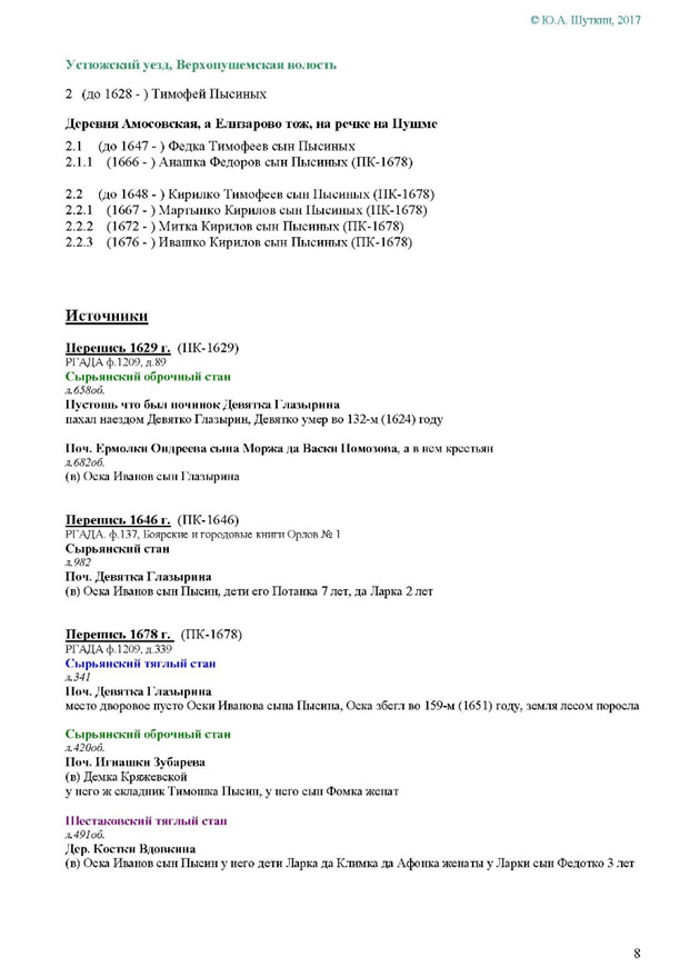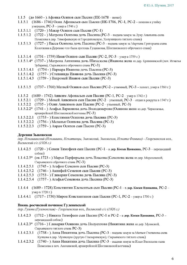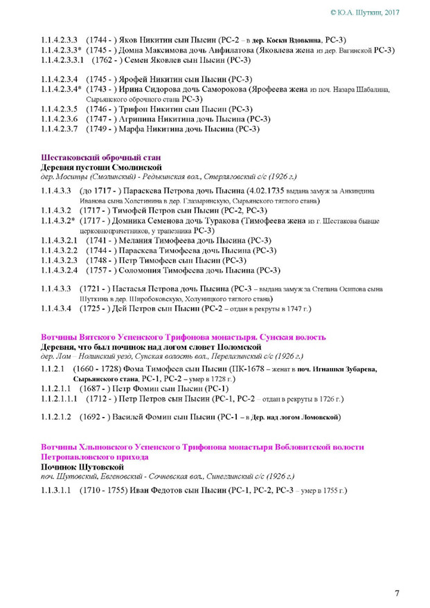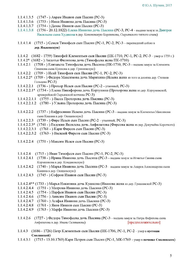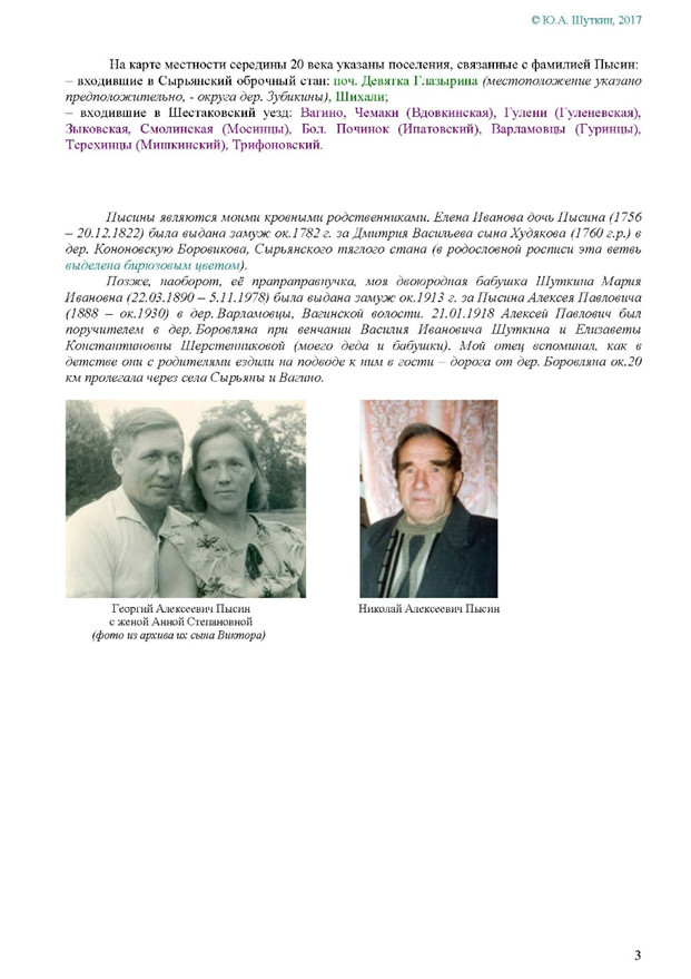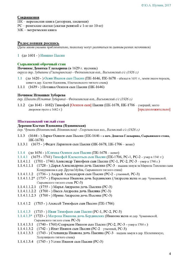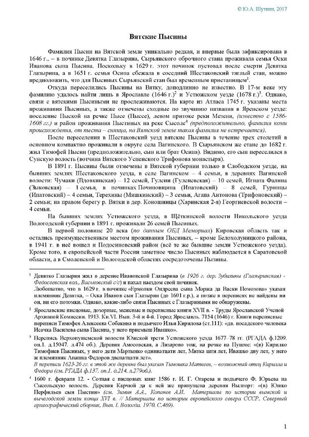 Фамилия Пысин на Вятской земле уникально редкая, и впервые была зафиксирована в 1646 г. в починке Девятка Глазырина, Сырьянского оброчного стана.