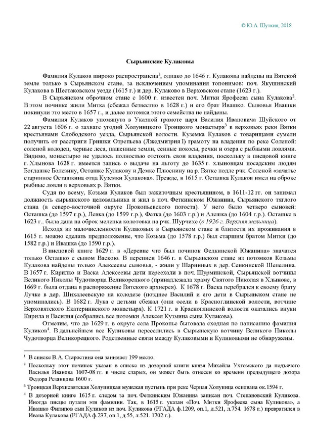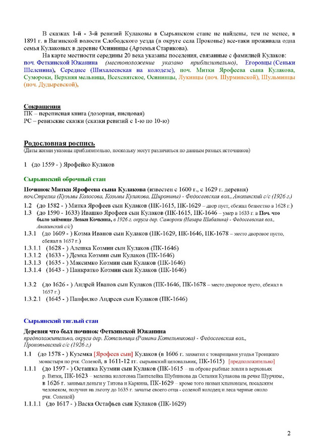 Фамилия Кулаков широко распространена, однако до 1646 г. Кулаковы найдены на Вятской земле только в Сырьянском стане.