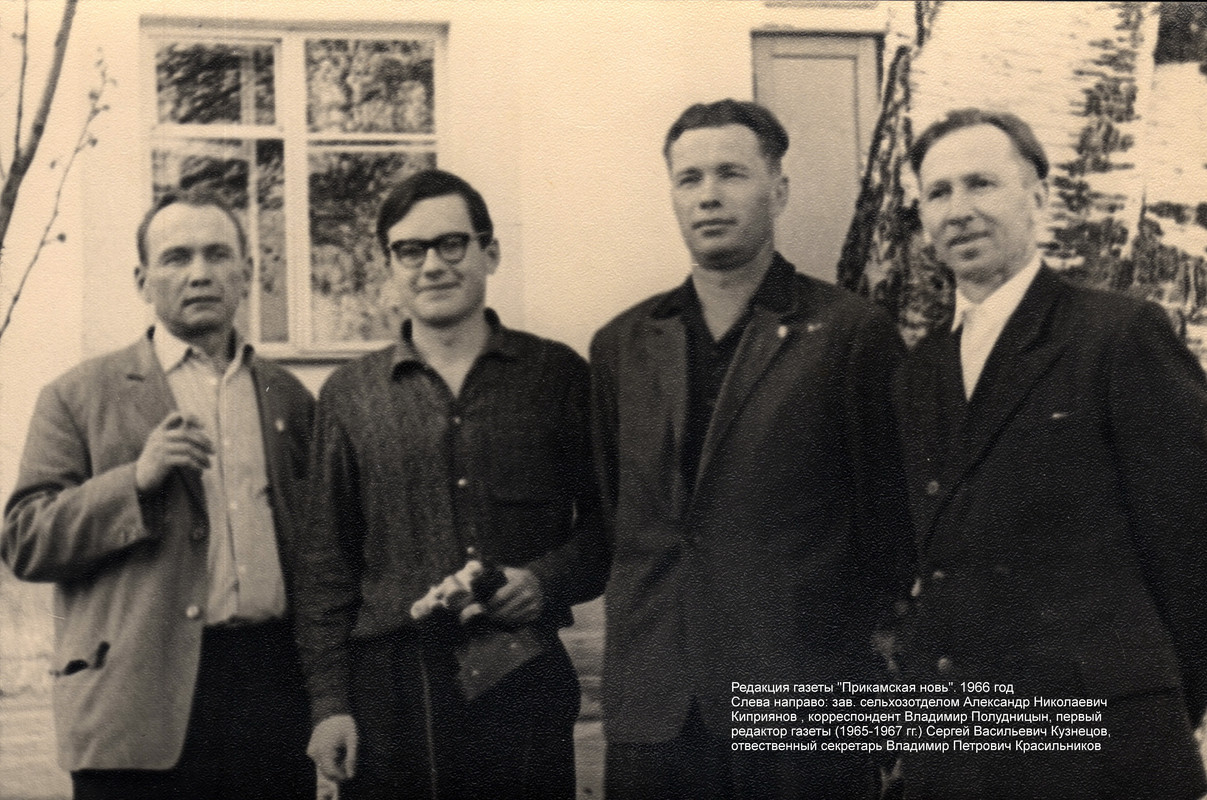 В Кирсе 58 лет назад начался мой журналистский путь. Литературный сотрудник. Так называлась самая начальная творческая должность в редакции с самым маленьким денежным окладом только что созданной районной газеты «Прикамская новь». Был ещё авторский гонорар. Но его надо было заработать собственными публикациями. А как его заработаешь, если и опыта нет, и писать-то как следует не умеешь. И к тому, и к другому дружески направляли новые старшие товарищи. Мне повезло. Большинство из них были профессионалами. Сергей Васильевич Кузнецов, Николай Иванович Плехов, Владимир Петрович Красильников, Александр Николаевич Киприянов наставляли, критиковали, хвалили, препарировали мои опусы, учили на своих примерах.