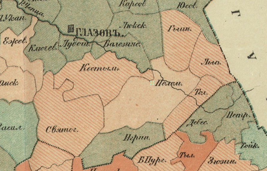 Конып/Канып - редкое название. В Поломской волости Вятского уезда их несколько, но все рядом, у речки Каныпки. В Глазовском уезде таких названий нет и не было. Но если вы посмотрите по КВР где жили Ворончихины в 1891 г., то увидите, что в Глазовском уезде жило много семей, в т.ч. в Поломской волости и в т.ч. в д.Олып, что вобщем-то созвучно с Каныпом, и писарь мог ошибочно так записать (обратите внимание, что двумя записями выше д.Канып уже звучала, но там она - Вятского уезда). Так что оба варианта возможны: 1) ваши Ворончихины из д.Конып/Канып Поломской волости Вятского уезда; 2) ваши Ворончихины из д.Олып Поломской волости Глазовского уезда. Я не представляю как Вятский уезд может перепутаться с Глазовским, поэтому склоняюсь ко второму, но надо проверять оба.