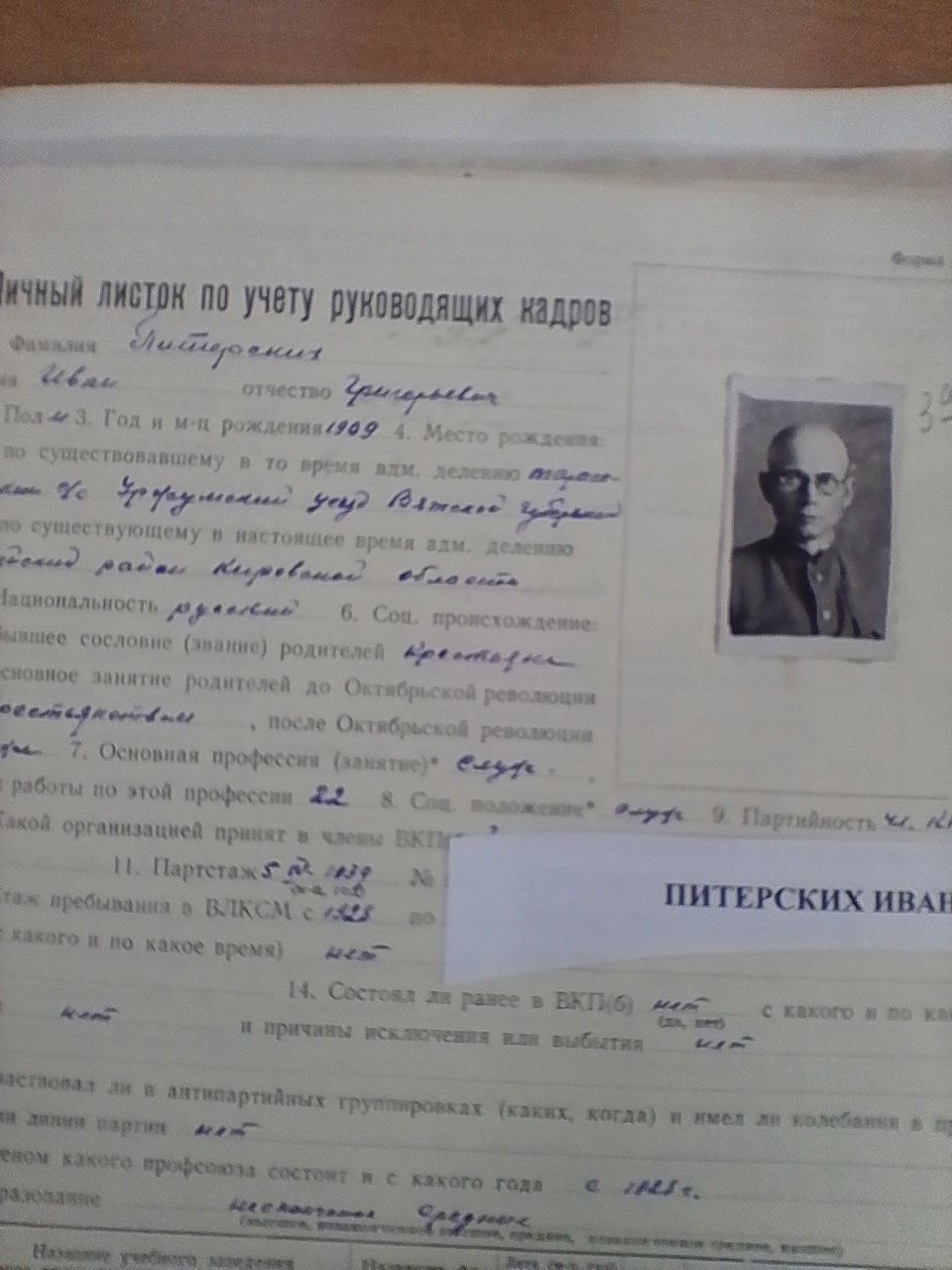 | Родился | 1909 | починок Тарасовский (Уржумский район, Кировская область) - существующий н.п. | Брат - Питерских Александр Григорьевич (1910 - 26.07.1944) Участник ВОв. Погиб в бою: 26.07.1944 |