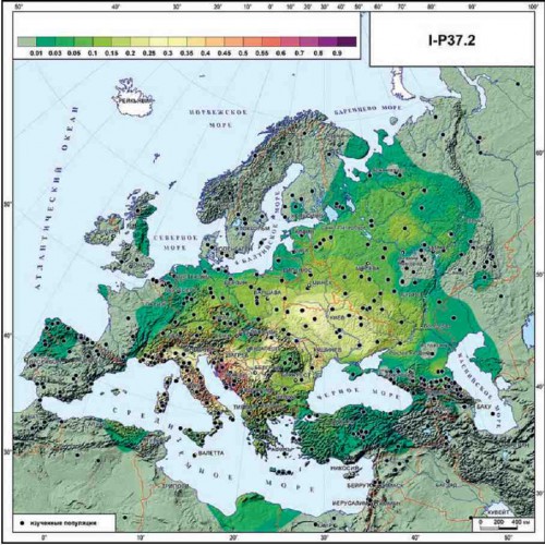 Распространение гаплогруппы I-Р37.2 в Европе. Выбрана карта этого субклада потому, что с течением времени положение субкладов на древе ISOGG меняется, I2a1b на момент составления данного изображения входила в субклад I-Р37.2 (изображение из открытых источников Генография Y- хромосомы в Европе, О.Балановский)