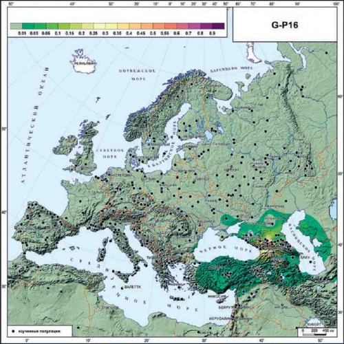 Распространение гаплогруппы G-P16 в Европе. Выбрана карта этого субклада несмотря на то, что в ISOGG-2020 в настоящее время этот снип не используется, эта карта наиболее близка к распространению гаплогруппы G2a2b1a1a (изображение из открытых источников Генография Y- хромосомы в Европе, О.Балановский)