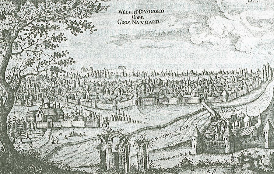 Великий Новгород, рисунок из книги Описание путешествия в Московию и через Московию в Персию и обратно, Адам Олеарий, изображение из открытых источников.