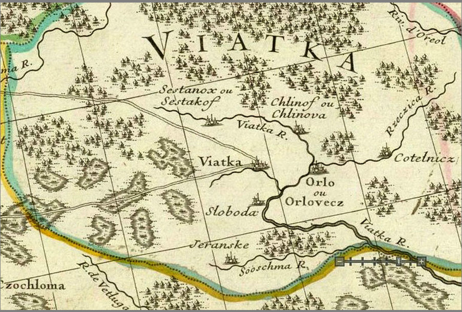 Здравствуйте, Андрей Александрович! Я как-то не интересовался поиском этих городов на картах. Мне кажется, до КБЧ карты Руси, показывающей, что "Река Вятка пала в реку Каму с правой стороны, а вытекла река Вятка от верху реки Камы и потекла под Вятцкие городы", не было. Иностранные карты рисовались со слов путешественников, и реки там обозначались условно. Та же карта Делиля показывает, практически, почти все города, но конфигурация рек не по КБЧ, иначе Кама и Вятка встречались бы в верховьях и расходились, а потом сливались в одну реку в устье Вятки. На карте Делиля город Вятка расположен на Моломе, и от него идут торговые пути, а Хлынов - в среднем течении Вятки. Остальные города расставлены, где придётся. Среднее течение Вятки и Камы было вне границ какого-либо государства, и скопировать расположение рек на этой территории было некому.