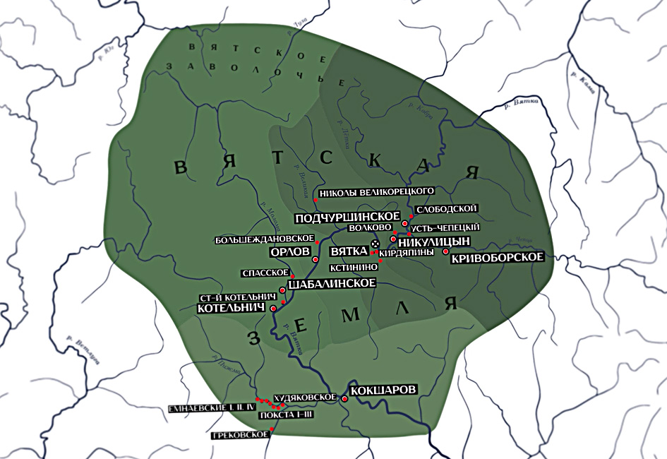По археологическим данным Л. Д. Макарова (Ижевск) на Вятской земле в XII—XV веках существовали 4 отдельные территории: