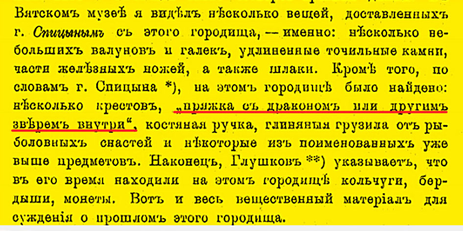 А текст о Котельничском городище между Вяткой и Котлянкой. "Пряжка с изображением дракона или другого зверя", найденная А.А. Спицыным, говорит о булгарском артефакте. Летопись из свода "Джагфар тарихы" под названием "Гази-Барадж тарихы" (1229-1246 гг.) - барадж, по-булгарски, дракон. Такое прозвище себе взял Гази-Барадж, предок И.М.-К. Нигматуллина, переводчика свода "Джагфар тарихы". В скобках, вероятно, - годы его правления на канском престоле. (Статья Кокшер, Кокшаров и Котельнич")