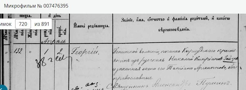 Родители: Понинской волости, деревни Кырлудской крестьянин из русских Николай Киприанов Зайцев и законная жена его Татиана Архипова, оба православные