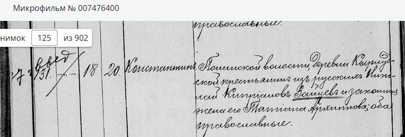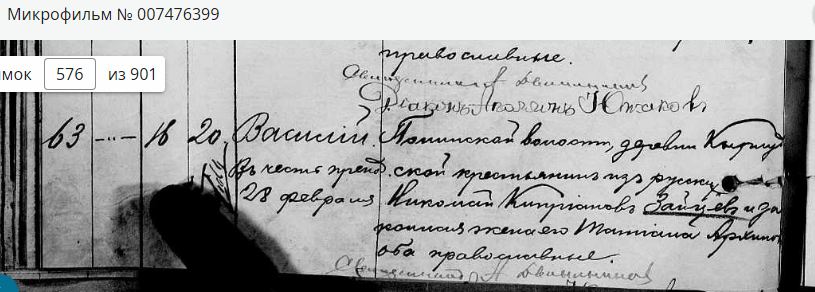 Родители: Понинской волости, починка Кырлудскаго крестьянин из русских Николай Киприанов Зайцев и законная жена его Татиана Архиппова, оба православные