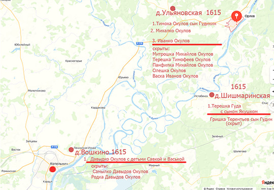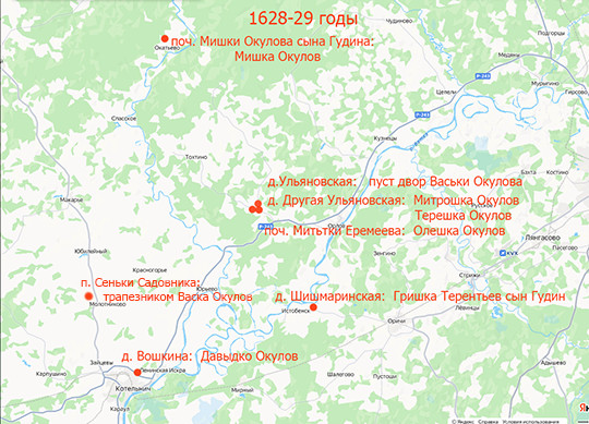 Кроме того, Терешка Гуда да сын его Якушко из дер. Шишмаринская и их потомки исключены из рассмотрения, так как прозвище Гуда не единственное, даже достаточно распространенное, соответственно возможно наличие других Гуда на территории Орловского уезда. Нет ни одного доказательства их причастности к братьям Окуловым-Гудихиным из деревень Ульяновское и Другое Ульяновское, например, через запись: Терешка Гуда Гудин (Гудихин) или Окулов [условный пример]. Тем более, что в 1617 г. он записан, как "(в) Терешка Чадын* с сыном". Полное именование его Терешка Гуда Чадын, где два имени: календарное и русское. Предполагать описку писца и читать, как Гудын ( Гудин) нет ни какого основания. [По крайней мере, нужны конкретные доказательства].